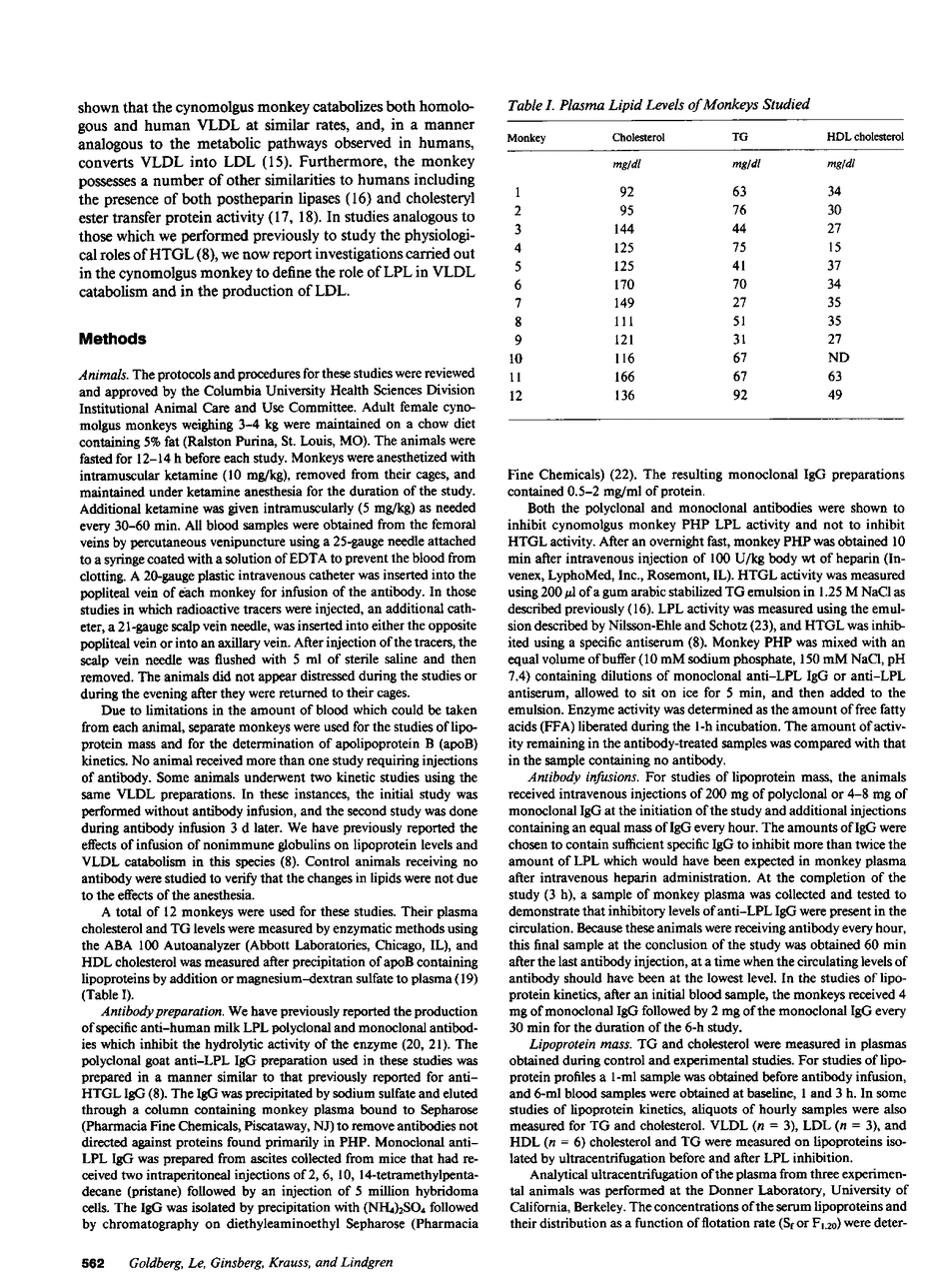 To clarify the role of lipoprotein lipase (LPL) in the catabolism of nascent and circulating very low density lipoproteins (VLDL) and in the conversion of VLDL to low density lipoproteins (LDL), studies were performed in which LPL activity was inhibited in the cynomolgus monkey by intravenous infusion of inhibitory polyclonal or monoclonal antibodies. Inhibition of LPL activity resulted in a three- to fivefold increase in plasma triglyceride levels within 3 h. Analytical ultracentrifugation and gradient gel electrophoresis demonstrated an increase predominantly in more buoyant, larger VLDL (Sf 400-60). LDL and high density lipoprotein (HDL) cholesterol levels fell during this same time period, whereas triglyceride in LDL and HDL increased. Kinetic studies, utilizing radiolabeled human VLDL, demonstrated that LPL inhibition resulted in a marked decrease in the catabolism of large (Sf 400-100) VLDL apolipoprotein B (apoB). The catabolism of more dense VLDL (Sf 60-20) was also inhibited, although to a lesser extent. However, there was a complete block in the conversion of tracer in both Sf 400-100 and 60-20 VLDL apoB into LDL during LPL inhibition. Similarly, endogenous labeling of VLDL using [3H]leucine demonstrated that in the absence of LPL, no radiolabeled apoB appeared in LDL. We conclude that although catabolism of dense VLDL continues in the absence of LPL, this enzyme is required for the generation of LDL.