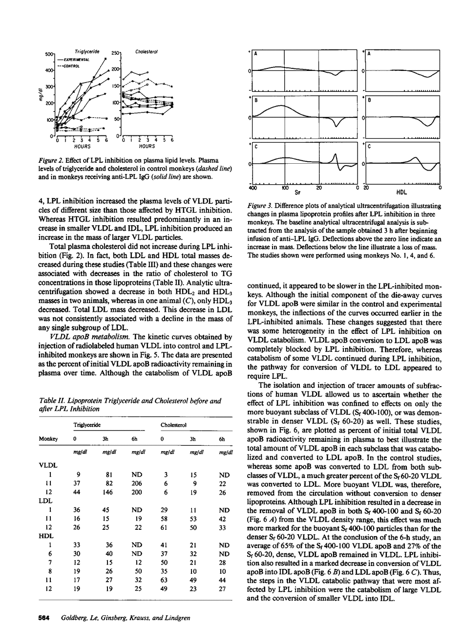 To clarify the role of lipoprotein lipase (LPL) in the catabolism of nascent and circulating very low density lipoproteins (VLDL) and in the conversion of VLDL to low density lipoproteins (LDL), studies were performed in which LPL activity was inhibited in the cynomolgus monkey by intravenous infusion of inhibitory polyclonal or monoclonal antibodies. Inhibition of LPL activity resulted in a three- to fivefold increase in plasma triglyceride levels within 3 h. Analytical ultracentrifugation and gradient gel electrophoresis demonstrated an increase predominantly in more buoyant, larger VLDL (Sf 400-60). LDL and high density lipoprotein (HDL) cholesterol levels fell during this same time period, whereas triglyceride in LDL and HDL increased. Kinetic studies, utilizing radiolabeled human VLDL, demonstrated that LPL inhibition resulted in a marked decrease in the catabolism of large (Sf 400-100) VLDL apolipoprotein B (apoB). The catabolism of more dense VLDL (Sf 60-20) was also inhibited, although to a lesser extent. However, there was a complete block in the conversion of tracer in both Sf 400-100 and 60-20 VLDL apoB into LDL during LPL inhibition. Similarly, endogenous labeling of VLDL using [3H]leucine demonstrated that in the absence of LPL, no radiolabeled apoB appeared in LDL. We conclude that although catabolism of dense VLDL continues in the absence of LPL, this enzyme is required for the generation of LDL.