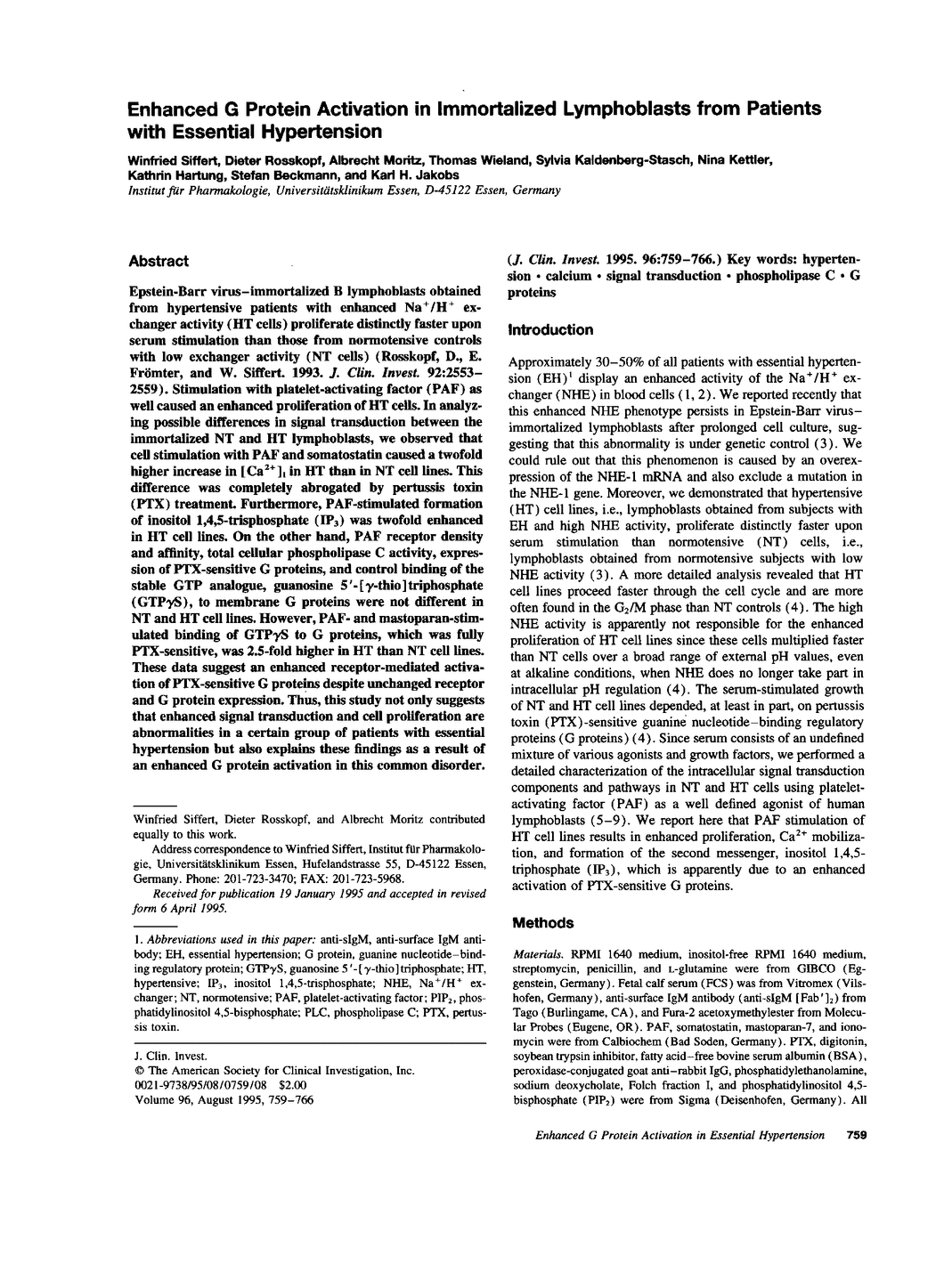 Epstein-Barr virus-immortalized B lymphoblasts obtained from hypertensive patients with enhanced Na+/H+ exchanger activity (HT cells) proliferate distinctly faster upon serum stimulation than those from normotensive controls with low exchanger activity (NT cells) (Rosskopf, D., E. Frömter, and W. Siffert. 1993. J. Clin. Invest. 92:2553-2559). Stimulation with platelet-activating factor (PAF) as well caused an enhanced proliferation of HT cells. In analyzing possible differences in signal transduction between the immortalized NT and HT lymphoblasts, we observed that cell stimulation with PAF and somatostatin caused a twofold higher increase in [Ca2+]i in HT than in NT cell lines. This difference was completely abrogated by pertussis toxin (PTX) treatment. Furthermore, PAF-stimulated formation of inositol 1,4,5-trisphosphate (IP3) was twofold enhanced in HT cell lines. On the other hand, PAF receptor density and affinity, total cellular phospholipase C activity, expression of PTX-sensitive G proteins, and control binding of the stable GTP analogue, guanosine 5'-[gamma-thio]triphosphate (GTP gamma S), to membrane G proteins were not different in NT and HT cell lines. However, PAF- and mastoparan-stimulated binding of GTP gamma S to G proteins, which was fully PTX-sensitive, was 2.5-fold higher in HT than NT cell lines. These data suggest an enhanced receptor-mediated activation of PTX-sensitive G proteins despite unchanged receptor and G protein expression. Thus, this study not only suggests that enhanced signal transduction and cell proliferation are abnormalities in a certain group of patients with essential hypertension but also explains these findings as a result of an enhanced G protein activation in this common disorder.