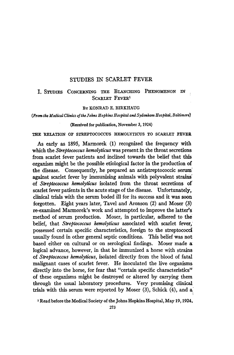 I. Studies Concerning the Blanching Phenomenon in Scarlet Fever