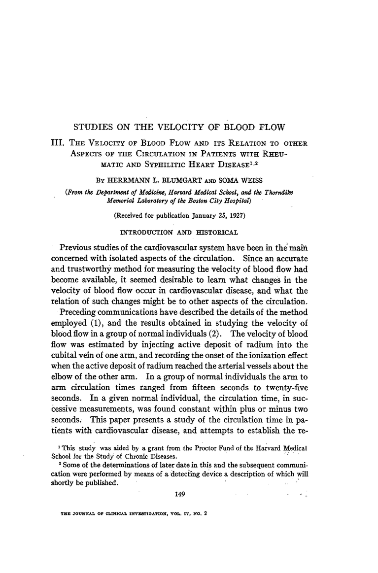 STUDIES ON THE VELOCITY OF BLOOD FLOW: