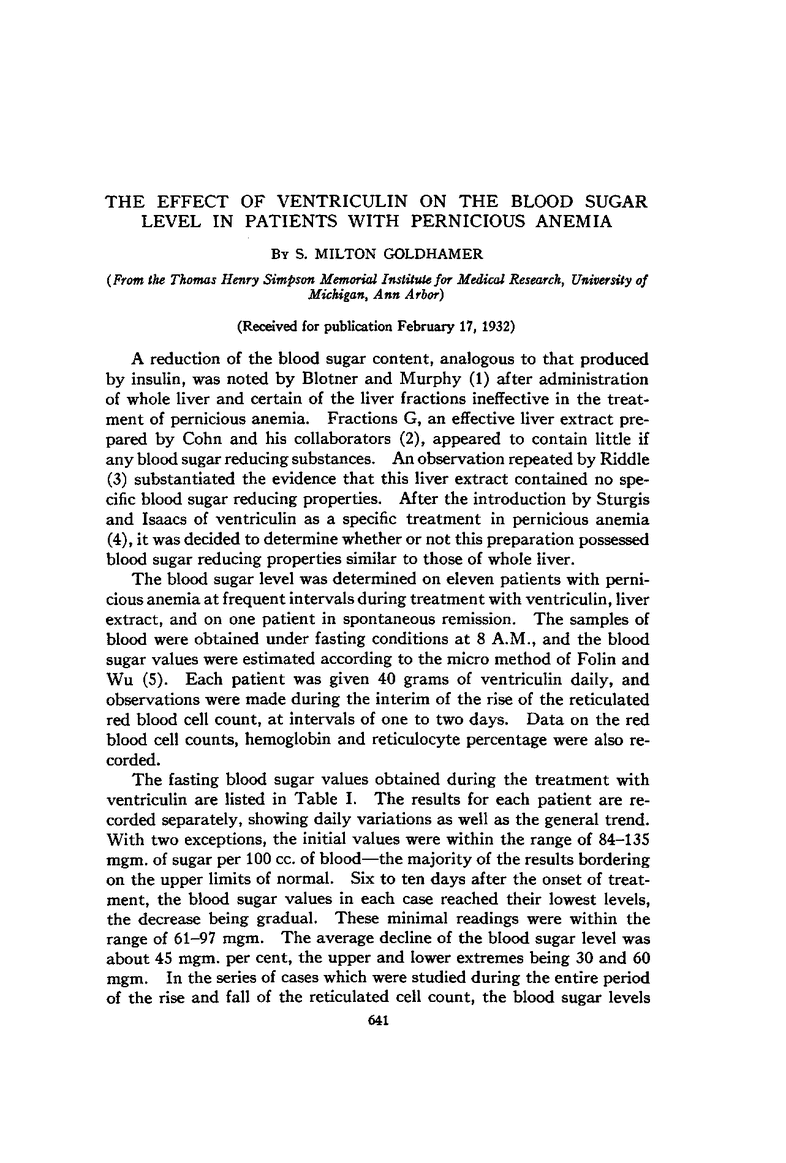 THE EFFECT OF VENTRICULIN ON THE BLOOD SUGAR LEVEL IN PATIENTS WITH PERNICIOUS ANEMIA