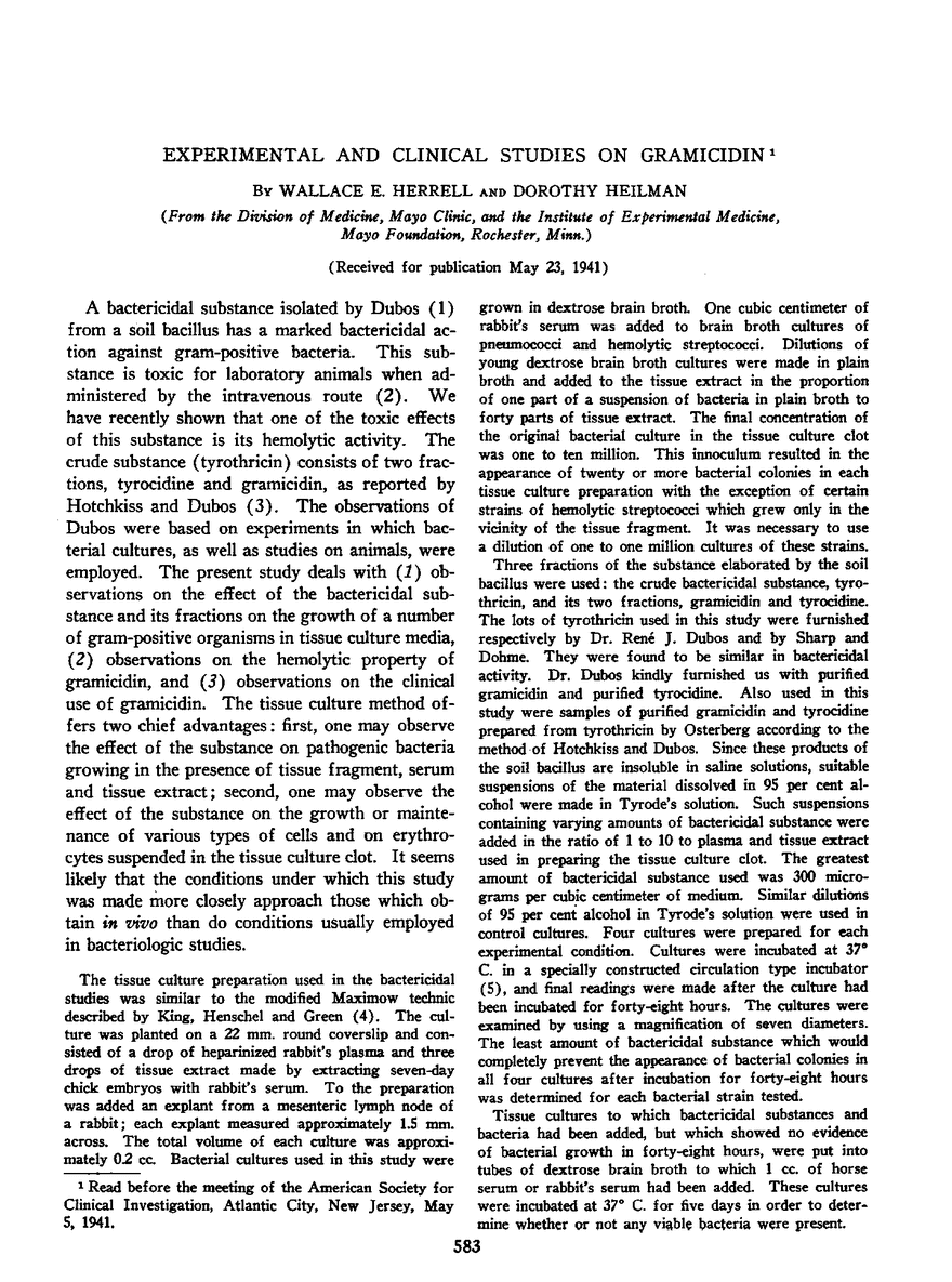 EXPERIMENTAL AND CLINICAL STUDIES ON GRAMICIDIN