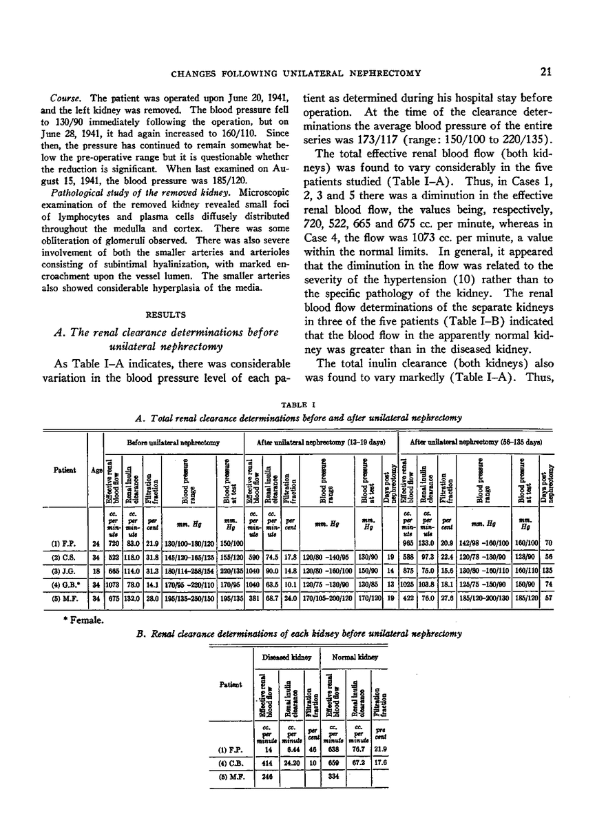 THE CHANGES IN THE BLOOD PRESSURE AND IN THE RENAL BLOOD FLOW AND GLOMERULAR FILTRATION RATE OF HYPERTENSIVE PATIENTS FOLLOWING UNILATERAL NEPHRECTOMY