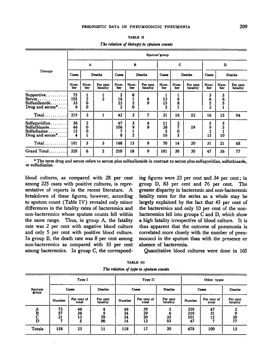 PNEUMOCOCCIC PNEUMONIA: THE PROGNOSTIC SIGNIFICANCE OF THE NUMBER OF PNEUMOCOCCI IN THE SPUTUM IN RELATION TO THERAPY, BACTEREMIA, TYPE, LEUKOCYTE COUNT, DURATION OF THE DISEASE, AGE, AND DEGREE OF INVOLVEMENT