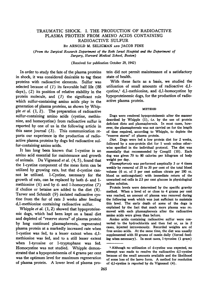 TRAUMATIC SHOCK. I. THE PRODUCTION OF RADIOACTIVE PLASMA PROTEIN FROM AMINO ACIDS CONTAINING RADIOACTIVE SULFUR