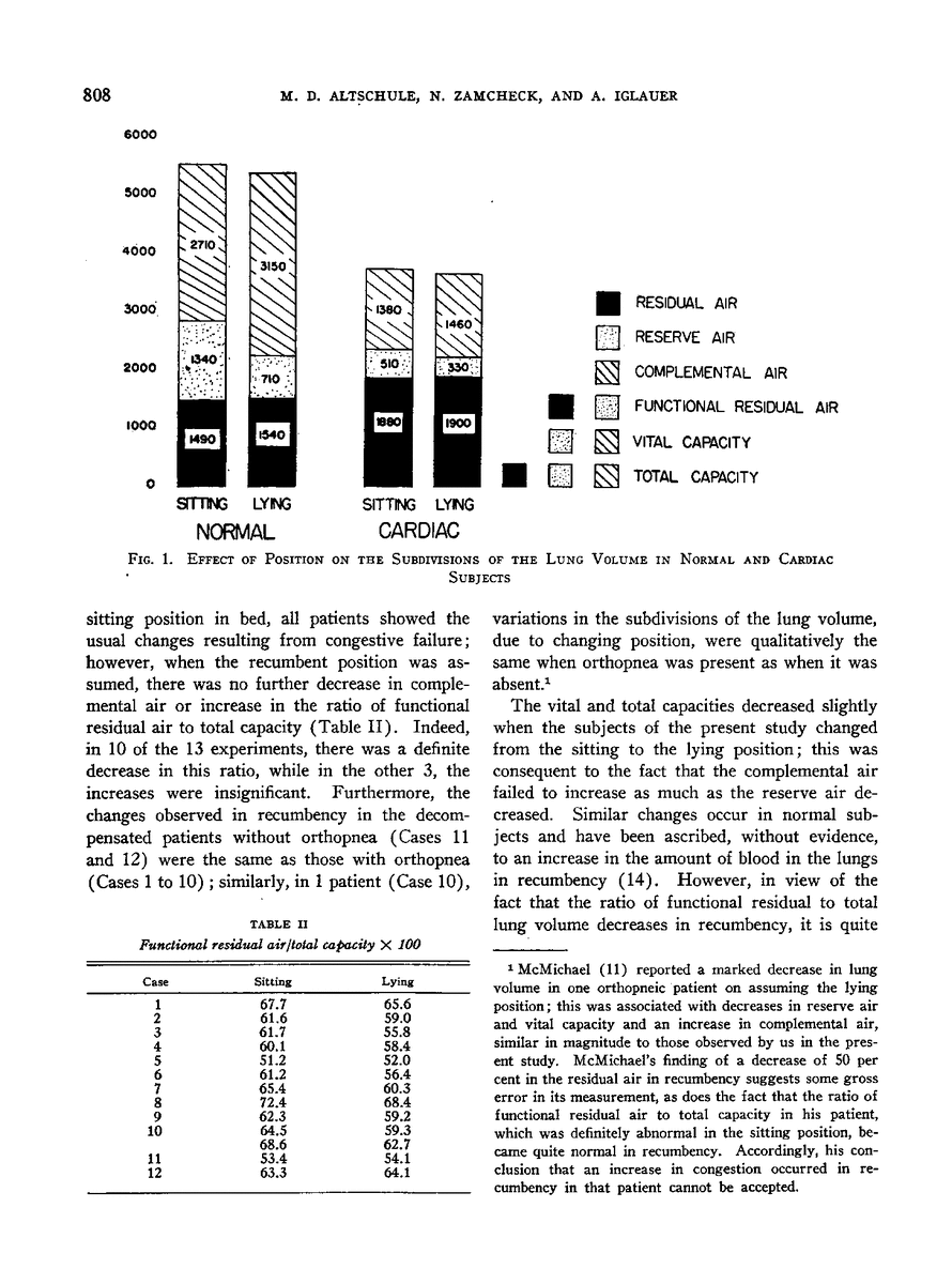 THE LUNG VOLUME AND ITS SUBDIVISIONS IN THE UPRIGHT AND RECUMBENT POSITIONS IN PATIENTS WITH CONGESTIVE FAILURE. PULMONARY FACTORS IN THE GENESIS OF ORTHOPNEA