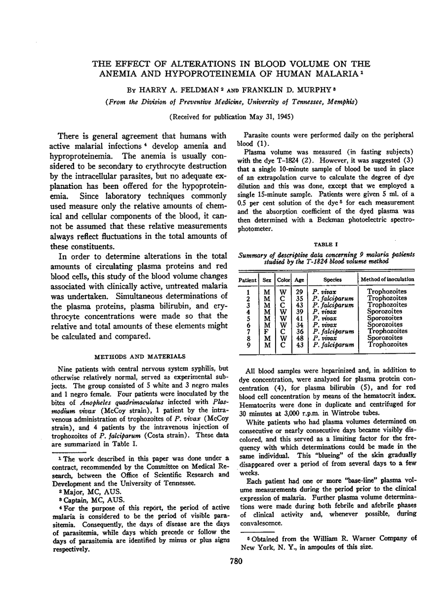 THE EFFECT OF ALTERATIONS IN BLOOD VOLUME ON THE ANEMIA AND HYPOPROTEINEMIA OF HUMAN MALARIA