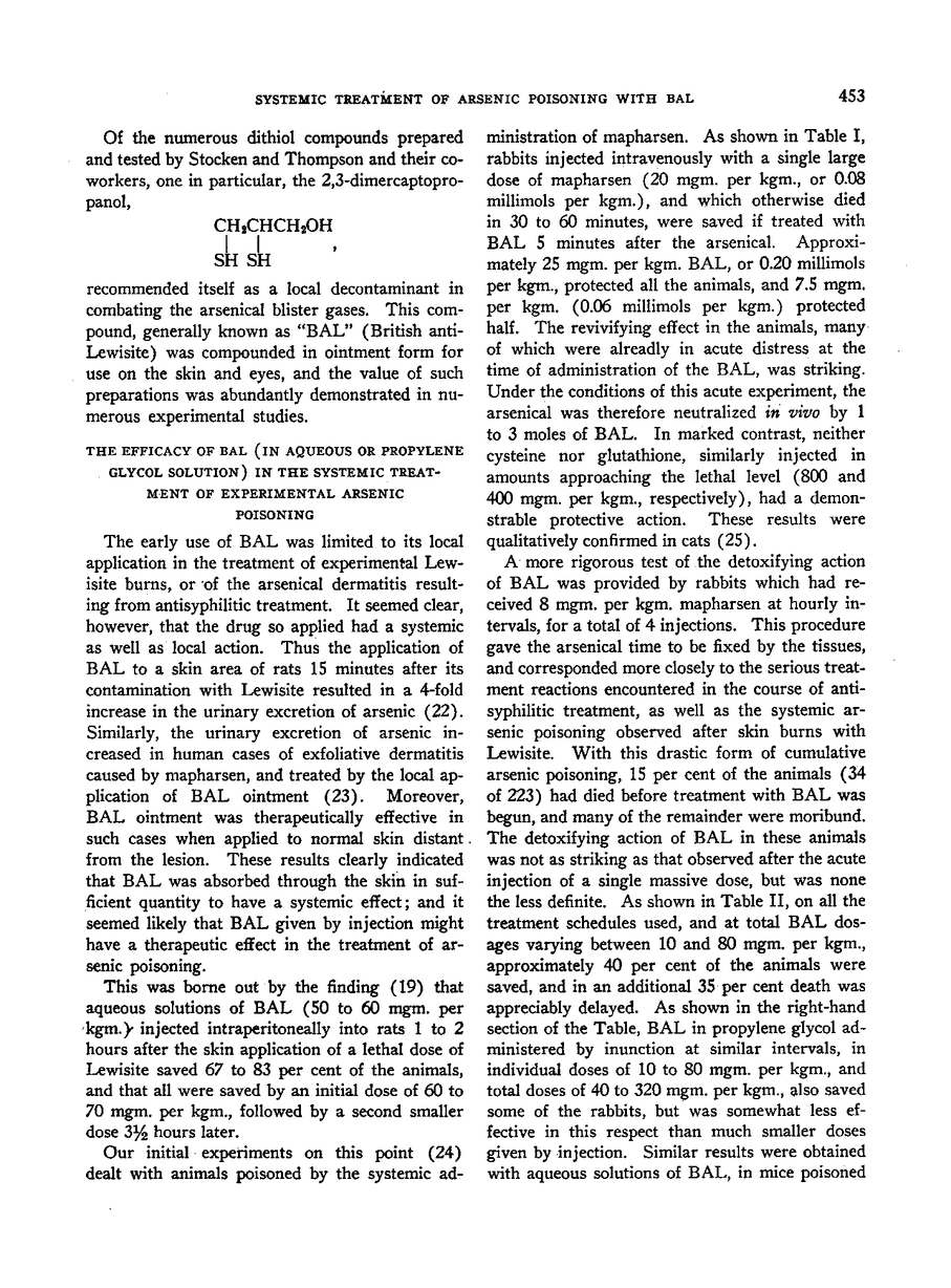 CLINICAL USES OF 2,3—DIMERCAPTOPROPANOL (BAL). I. THE SYSTEMIC TREATMENT OF EXPERIMENTAL ARSENIC POISONING (MAPHARSEN, LEWISITE, PHENYL ARSENOXIDE) WITH BAL