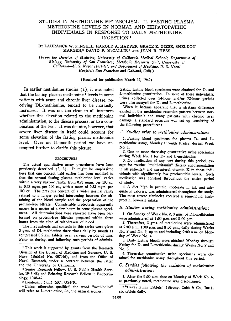 Laurance W. Kinsell, Harold A. Harper, Grace K. Giese, Sheldon Margen, David P. McCallie, Jean R. Hess