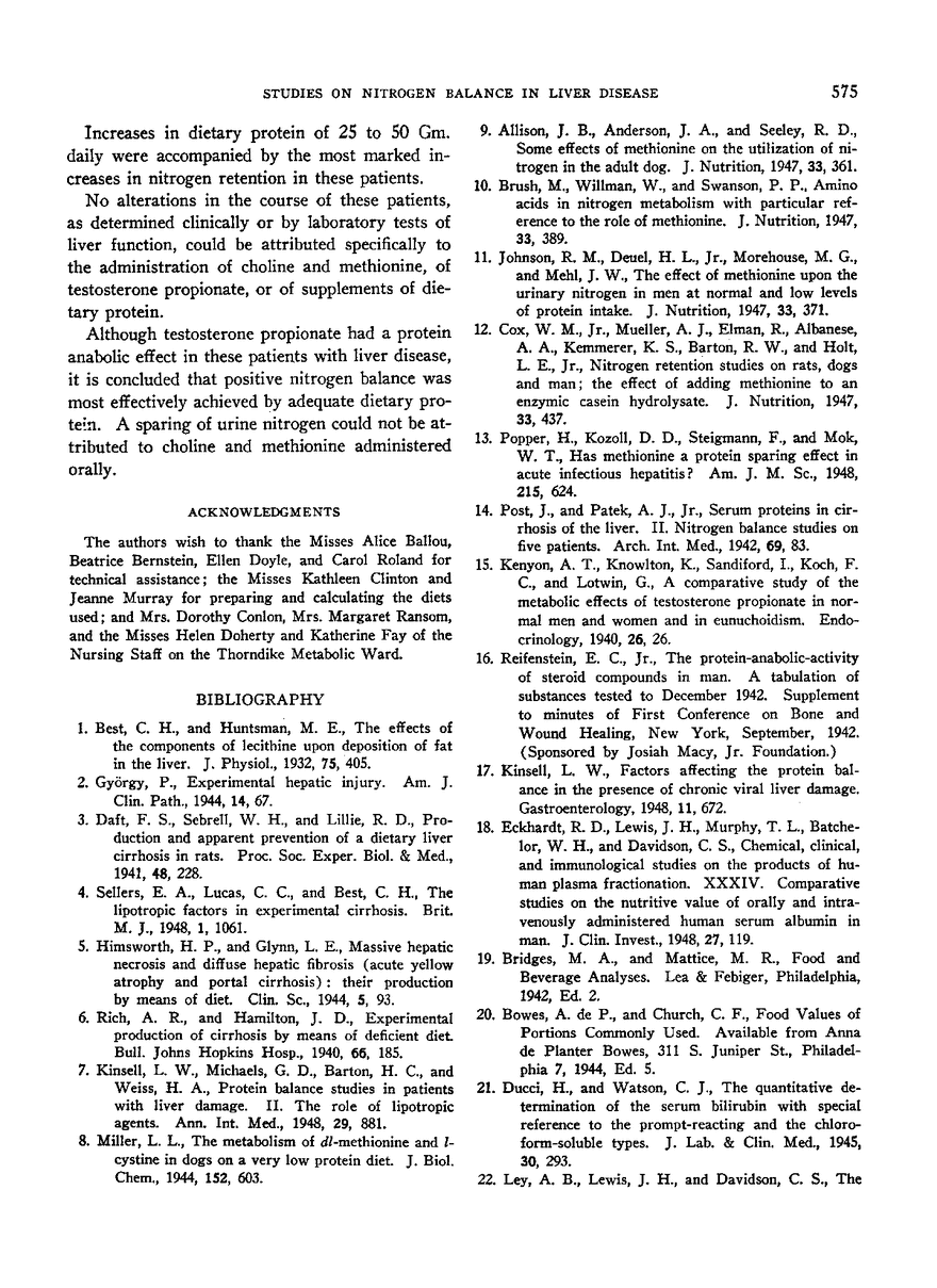 EFFECT OF CHOLINE AND METHIONINE, TESTOSTERONE PROPIONATE, AND DIETARY PROTEIN ON NITROGEN BALANCE IN PATIENTS WITH LIVER DISEASE