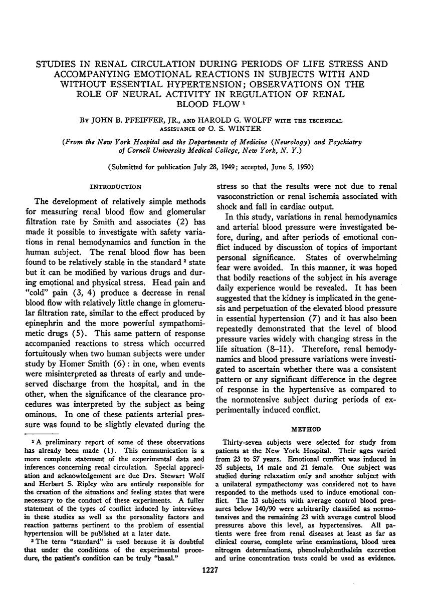 STUDIES IN RENAL CIRCULATION DURING PERIODS OF LIFE STRESS AND ACCOMPANYING EMOTIONAL REACTIONS IN SUBJECTS WITH AND WITHOUT ESSENTIAL HYPERTENSION; OBSERVATIONS ON THE ROLE OF NEURAL ACTIVITY IN REGULATION OF RENAL BLOOD FLOW