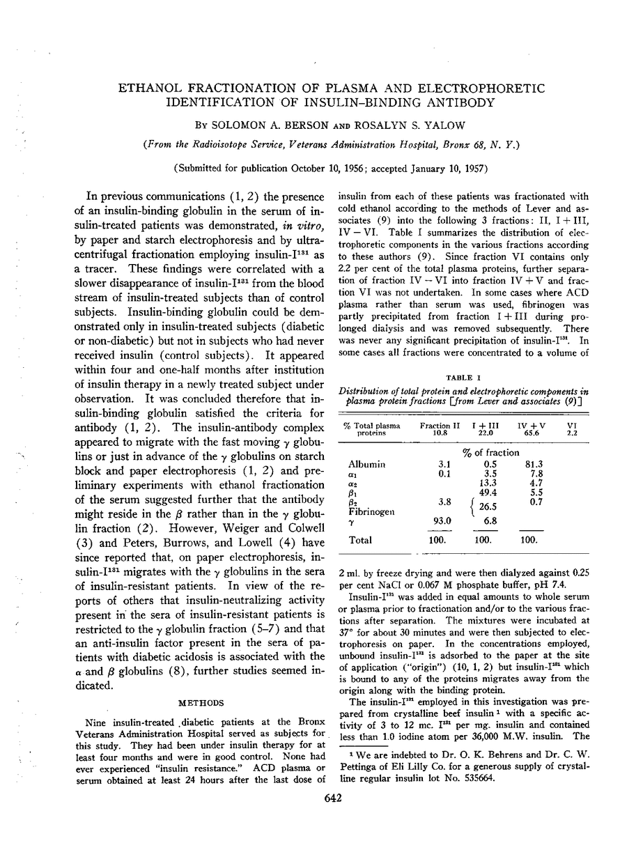 ETHANOL FRACTIONATION OF PLASMA AND ELECTROPHORETIC IDENTIFICATION OF INSULIN-BINDING ANTIBODY