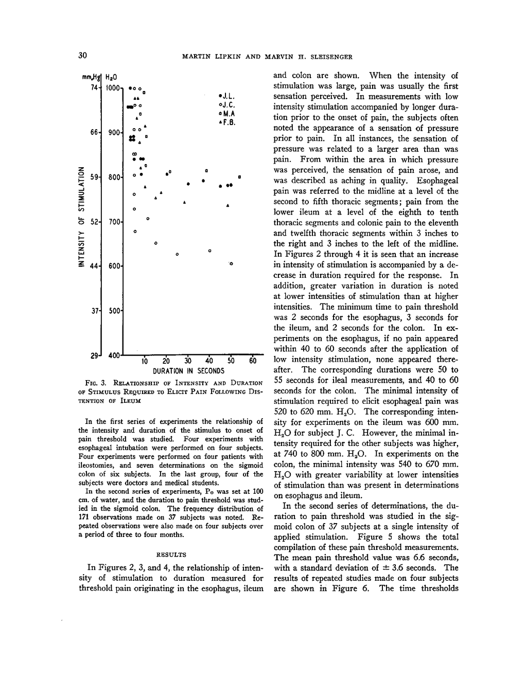 STUDIES OF VISCERAL PAIN: MEASUREMENTS OF STIMULUS INTENSITY AND DURATION ASSOCIATED WITH THE ONSET OF PAIN IN ESOPHAGUS, ILEUM AND COLON