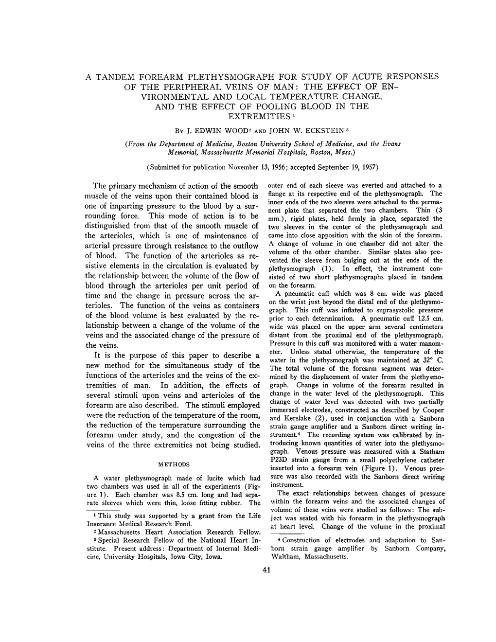 A TANDEM FOREARM PLETHYSMOGRAPH FOR STUDY OF ACUTE RESPONSES OF THE PERIPHERAL VEINS OF MAN: THE EFFECT OF ENVIRONMENTAL AND LOCAL TEMPERATURE CHANGE, AND THE EFFECT OF POOLING BLOOD IN THE EXTREMITIES