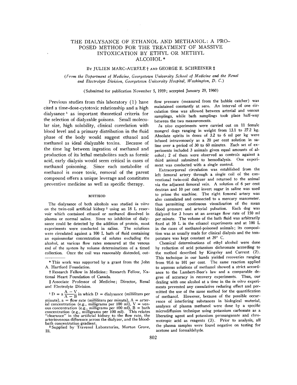 THE DIALYSANCE OF ETHANOL AND METHANOL: A PROPOSED METHOD FOR THE TREATMENT OF MASSIVE INTOXICATION BY ETHYL OR METHYL ALCOHOL