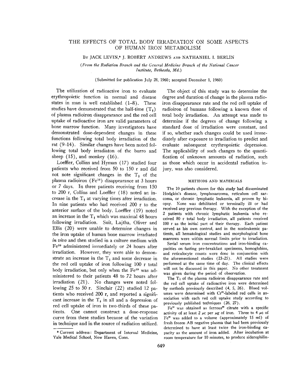 THE EFFECTS OF TOTAL BODY IRRADIATION ON SOME ASPECTS OF HUMAN IRON METABOLISM