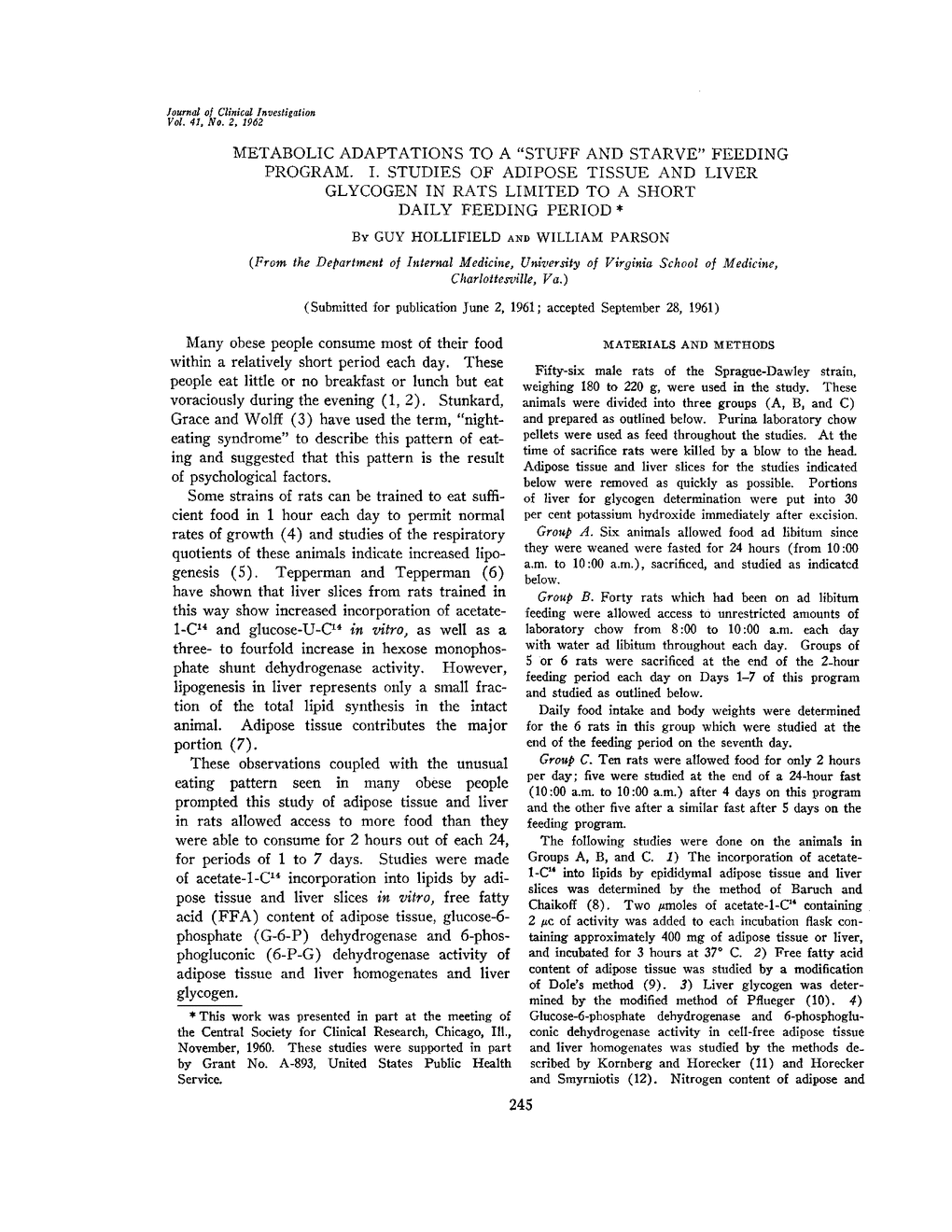 METABOLIC ADAPTATIONS TO A “STUFF AND STARVE” FEEDING PROGRAM. I. STUDIES OF ADIPOSE TISSUE AND LIVER GLYCOGEN IN RATS LIMITED TO A SHORT DAILY FEEDING PERIOD
