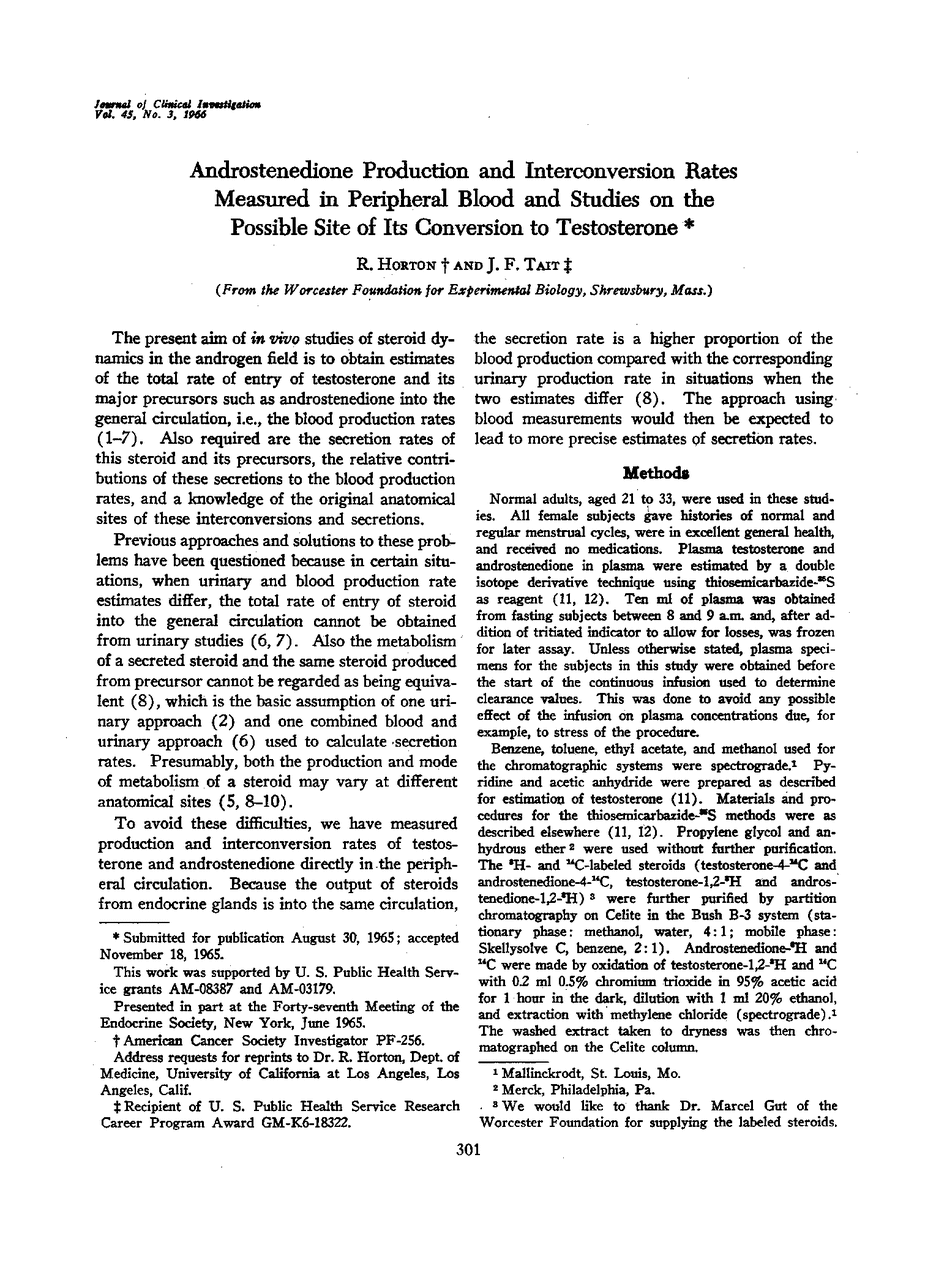 Androstenedione production and interconversion rates measured in peripheral blood and studies on the possible site of its conversion to testosterone.