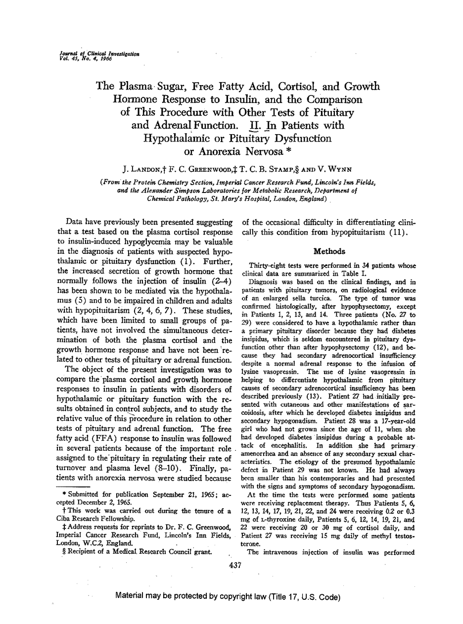 The plasma sugar, free fatty acid, cortisol, and growth hormone response to insulin, and the comparison of this procedure with other tests of pituitary and adrenal function. II. In patients with hypothalamic or pituitary dysfunction or anorexia nervosa.