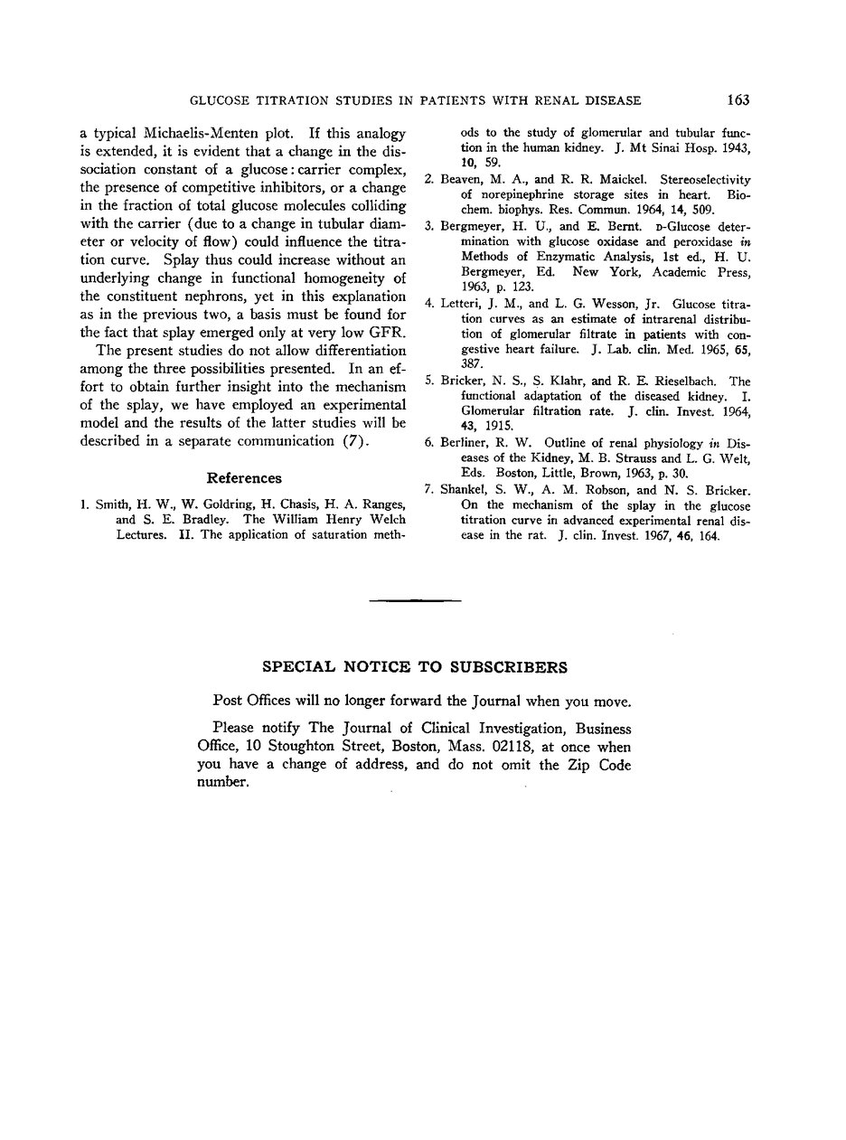 Glucose titration studies were performed on 17 patients with either chronic pyelonephritis or chronic glomerulonephritis. Glomerular filtration rates for the group ranged from 4.3 to 58.1 ml per minute. In none of the patients in whom the glomerular filtration rate was over 15 ml per minute was there appreciable splay, and the mean titration curve for these patients resembled that obtained by Smith and associates in normal man (1). In half of this group of eight patients, GFR ranged from 16.6 to 22.7 ml per minute; in the other half values ranged from 42.3 to 58.1 ml per minute. Yet, the mean titration curves were identical for the two groups. In addition, no difference was observed in the titration curves for patients with pyelonephritis and those with glomerulonephritis. In patients with GFR values below 15 ml per minute, increased splay was observed, and below a GFR of 10 ml per minute, the splay was very marked. Both the absence of exaggerated splay in patients with reduction of glomerular filtration rate by as much as 85%, and the emergence of exaggerated splay in patients with more marked reduction of GFR, require explanation. Theoretical considerations are presented in the text.