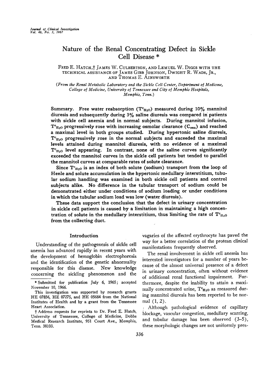 Free water reabsorption (TcH2O) measured during 10% mannitol diuresis and subsequently during 3% saline diuresis was compared in patients with sickle cell anemia and in normal subjects. During mannitol infusion, TcH2O progressively rose with increasing osmolar clearance (Cosm) and reached a maximal level in both groups studied. During hypertonic saline diuresis, TcH2O progressively rose in the normal subjects and exceeded the maximal levels attained during mannitol diuresis, with no evidence of a maximal TcH2O level appearing. In contrast, none of the saline curves significantly exceeded the mannitol curves in the sickle cell patients but tended to parallel the mannitol curves at comparable rates of solute clearance.