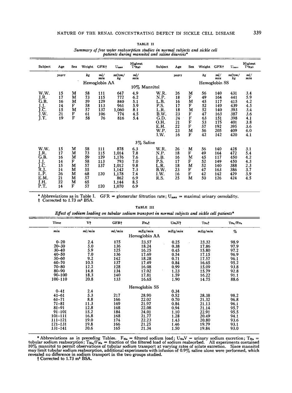 Free water reabsorption (TcH2O) measured during 10% mannitol diuresis and subsequently during 3% saline diuresis was compared in patients with sickle cell anemia and in normal subjects. During mannitol infusion, TcH2O progressively rose with increasing osmolar clearance (Cosm) and reached a maximal level in both groups studied. During hypertonic saline diuresis, TcH2O progressively rose in the normal subjects and exceeded the maximal levels attained during mannitol diuresis, with no evidence of a maximal TcH2O level appearing. In contrast, none of the saline curves significantly exceeded the mannitol curves in the sickle cell patients but tended to parallel the mannitol curves at comparable rates of solute clearance.