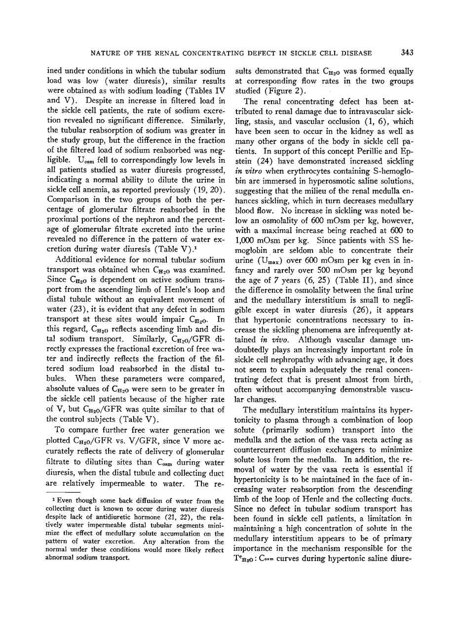 Free water reabsorption (TcH2O) measured during 10% mannitol diuresis and subsequently during 3% saline diuresis was compared in patients with sickle cell anemia and in normal subjects. During mannitol infusion, TcH2O progressively rose with increasing osmolar clearance (Cosm) and reached a maximal level in both groups studied. During hypertonic saline diuresis, TcH2O progressively rose in the normal subjects and exceeded the maximal levels attained during mannitol diuresis, with no evidence of a maximal TcH2O level appearing. In contrast, none of the saline curves significantly exceeded the mannitol curves in the sickle cell patients but tended to parallel the mannitol curves at comparable rates of solute clearance.