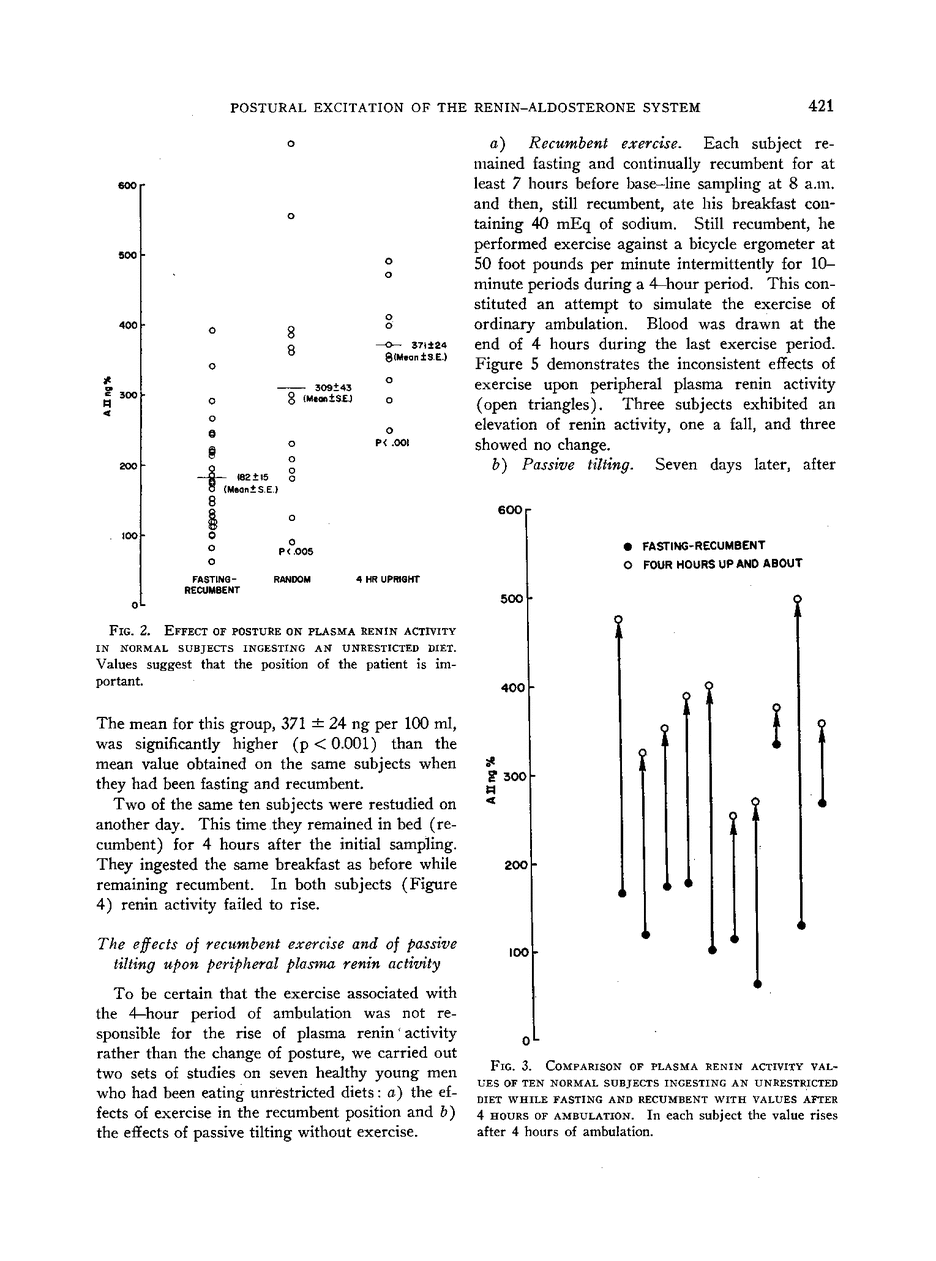 Peripheral plasma renin activity and aldosterone excretion rates have been measured in normal people during recumbency, recumbent exercise, tilting, and continuous ambulation. Upright posture induces a prompt elevation in peripheral plasma renin activity beginning in 15 minutes and peaking between 60 and 120 minutes. Aldosterone excretion is increased during 120 minutes of upright posture and correlates directly with the elevation in renin activity. Upright posture induces increased plasma renin activity regardless of the level of sodium intake in the preparatory diet. Concomitant measurements of endogenous creatinine clearance and the rates of excretion of sodium and potassium suggest that a fall in renal arterial perfusion resulting from upright posture induces increased release of renin and the subsequent secondary stimulation of aldosterone secretion. Our data indicate that the changes in plasma renin activity are due to changes in the amount of the enzyme rather than to changes in other elements of the reninangiotensin systm. This report discusses the physiologic importance of postural augmentation of renin production, emphasizing that for proper interpretation of values of plasma renin activity, posture as well as dietary factors must be considered and controlled.