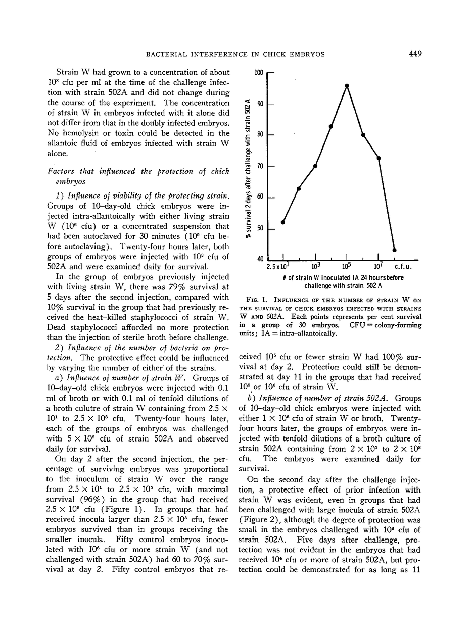 Chick embryos infected intra-allantoically with nonvirulent staphylococci are protected from death due to infection with virulent staphylococci. The protection is associated with a delay in growth of the challenge strain and a delay in the production of toxic substances in the allantoic fluid. The protection is influenced by the number of bacteria in the protecting and challenge inocula and by the interval between the administration of the protecting and challenge strains. Protection cannot be transferred by administration of sterile filtrates of allantoic fluid in which the protecting strain has grown.