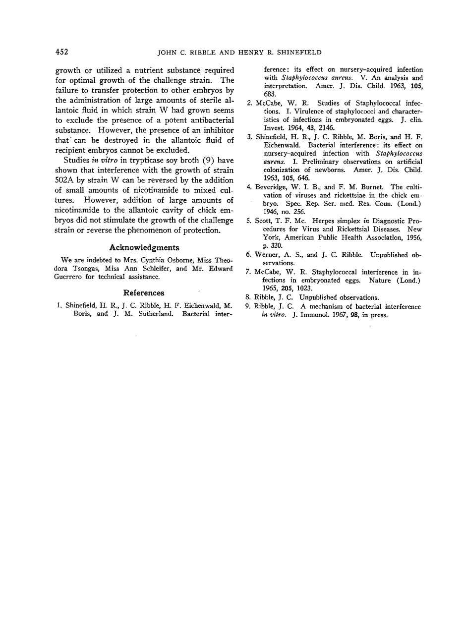 Chick embryos infected intra-allantoically with nonvirulent staphylococci are protected from death due to infection with virulent staphylococci. The protection is associated with a delay in growth of the challenge strain and a delay in the production of toxic substances in the allantoic fluid. The protection is influenced by the number of bacteria in the protecting and challenge inocula and by the interval between the administration of the protecting and challenge strains. Protection cannot be transferred by administration of sterile filtrates of allantoic fluid in which the protecting strain has grown.