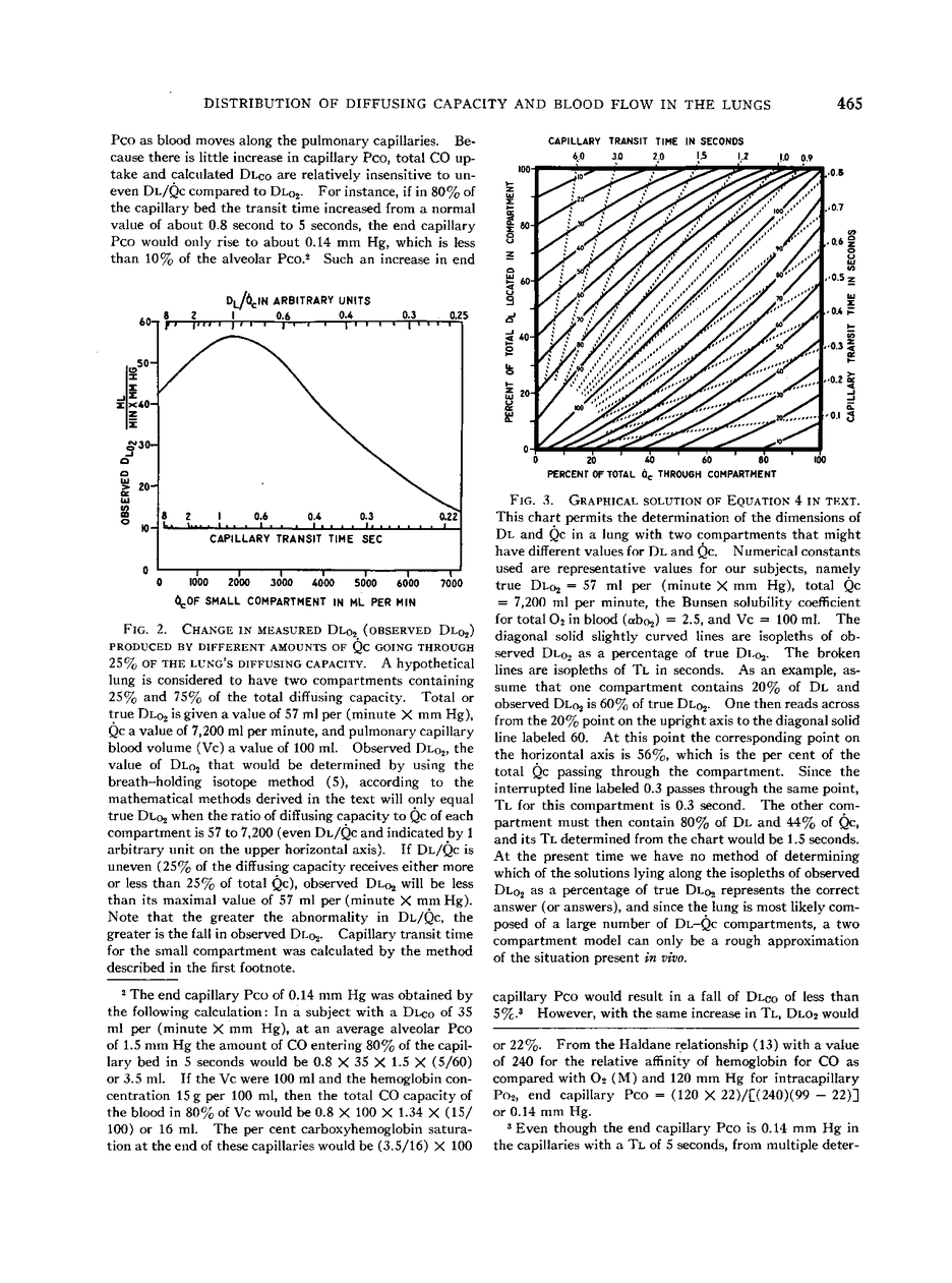 A method for appraising the distribution of diffusing capacity of the lungs (DL) in relationship to pulmonary capillary blood flow ([unk]QC) in normal human subjects was derived from measurements of oxygen diffusing capacity (DLO2) and carbon monoxide diffusing capacity (DLCO) performed during breath holding. This method utilizes the fact that the observed DLO2 is considerably reduced in value if uneven distribution of DL with respect to [unk]QC (uneven DL/[unk]QC) is present. In contrast, DLCO is barely affected by uneven DL/[unk]QC, and from its measured value one can calculate the value DLO2 would have if no uneven DL/[unk]QC were present (true DLO2). Once observed DLO2 and true DLO2 are known, the degree of uneven DL/[unk]QC in the lung can be calculated.