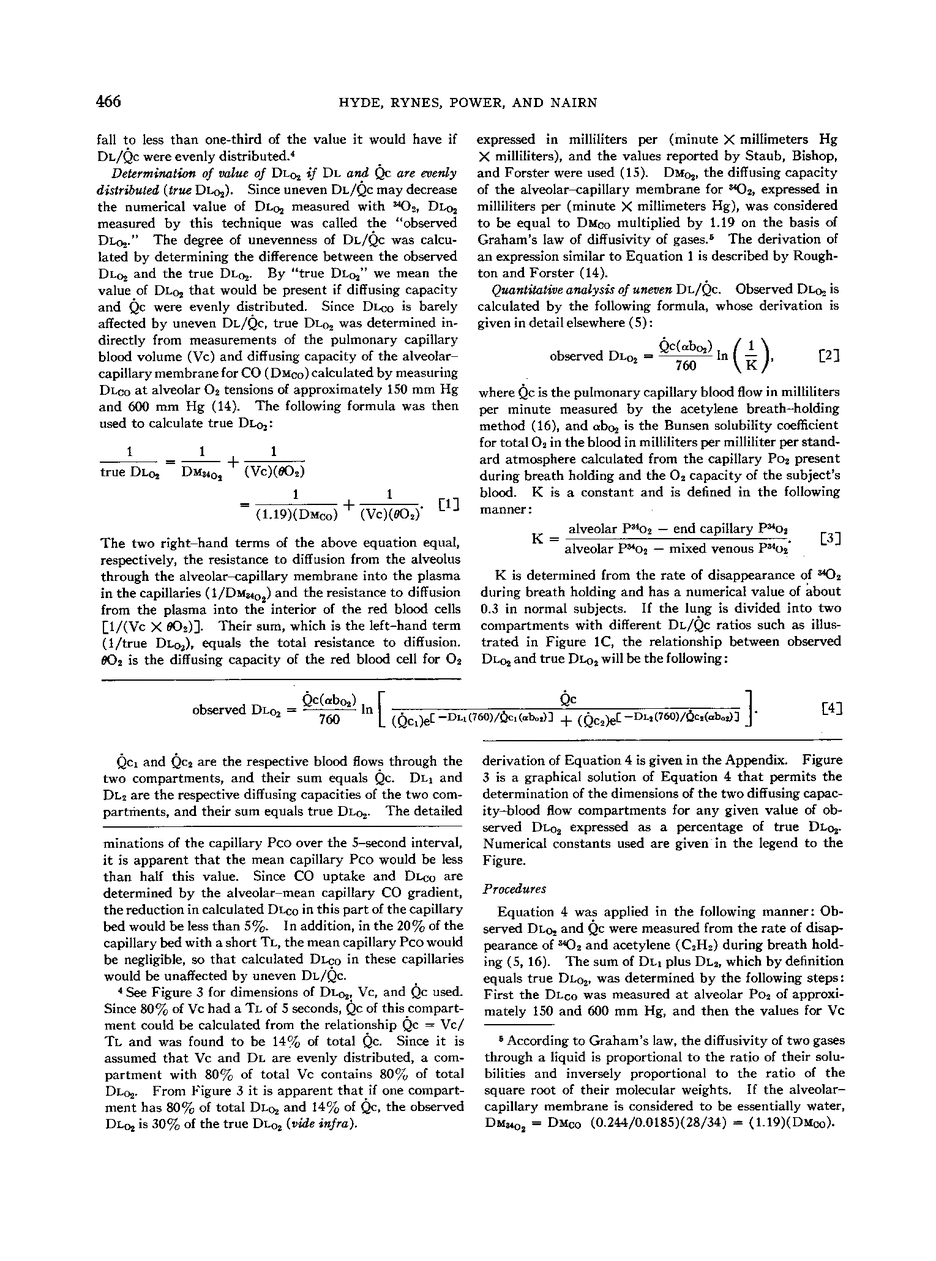 A method for appraising the distribution of diffusing capacity of the lungs (DL) in relationship to pulmonary capillary blood flow ([unk]QC) in normal human subjects was derived from measurements of oxygen diffusing capacity (DLO2) and carbon monoxide diffusing capacity (DLCO) performed during breath holding. This method utilizes the fact that the observed DLO2 is considerably reduced in value if uneven distribution of DL with respect to [unk]QC (uneven DL/[unk]QC) is present. In contrast, DLCO is barely affected by uneven DL/[unk]QC, and from its measured value one can calculate the value DLO2 would have if no uneven DL/[unk]QC were present (true DLO2). Once observed DLO2 and true DLO2 are known, the degree of uneven DL/[unk]QC in the lung can be calculated.