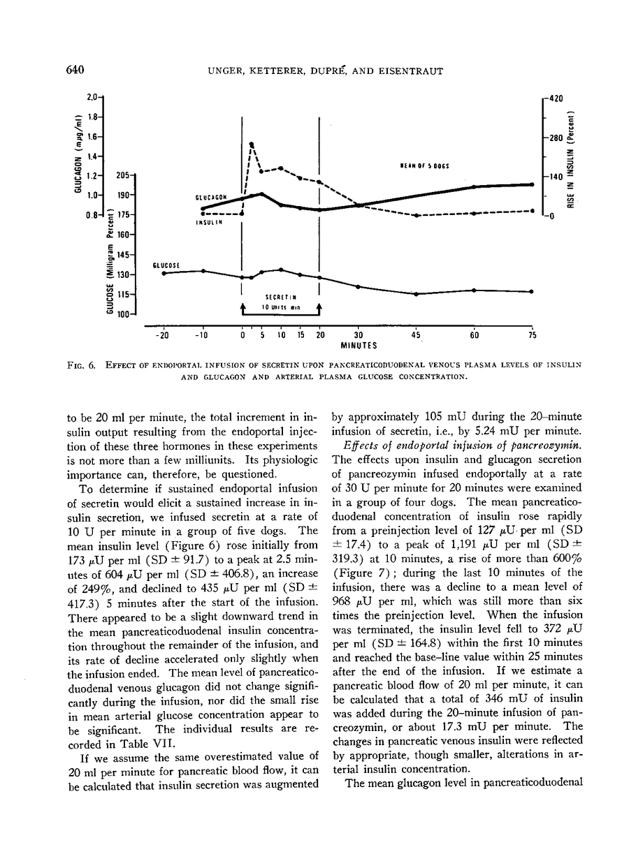 The effects upon islet hormone secretion of highly purified preparations of secretin and of pancreozymin-cholecystokinin and of a crude gastrin-containing extract of hog antrum have been studied in acutely operated dogs. All three preparations were shown to cause a striking increase in insulin concentration in the pancreaticoduodenal venous plasma after their rapid endoportal injection in anesthetized dogs. With each hormone preparation, the peak in insulin secretion occurred 1 minute after injection, and a rapid decline was observed immediately thereafter. Whereas secretin and gastrin failed to alter significantly the pancreaticoduodenal venous glucagon or arterial glucose concentration, pancreozymin caused a dramatic rise in pancreaticoduodenal venous glucagon concentration, which reached a peak 3 minutes after injection, and hyperglycemia was noted to occur soon thereafter. Endoportal infusion of secretin and pancreozymin for 20 minutes caused responses that were sustained but qualitatively identical to the responses noted after rapid injection of the hormones. The beta-cytotropic effect of secretin was abolished by the infusion of epinephrine.