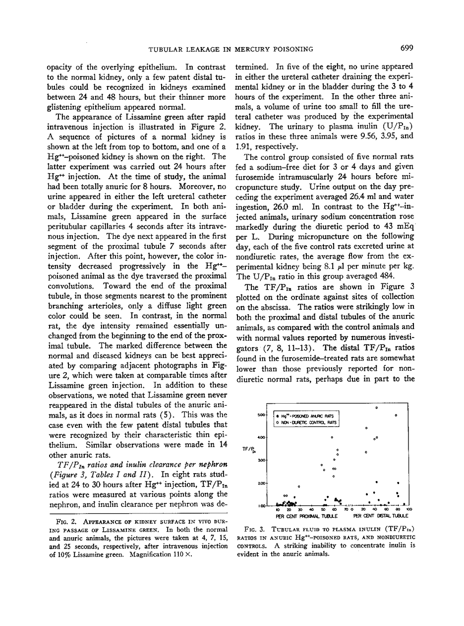 The role of “leakage” of tubular fluid in anuria produced by mercury poisoning was studied in rats by micropuncture techniques. After an initial brisk diuresis, almost all animals were completely anuric 24 hours after HgCl2 injection. Lissamine green injected intravenously in the early stage of anuria appeared in the beginning of the proximal tubule, but the color became progressively lighter as the dye traversed the proximal convolutions. The dye was barely visible in the terminal segments of the proximal tubule; it did not appear at all in the distal tubules. These observations suggest that the proximal epithelium had become abnormally permeable to Lissamine green.