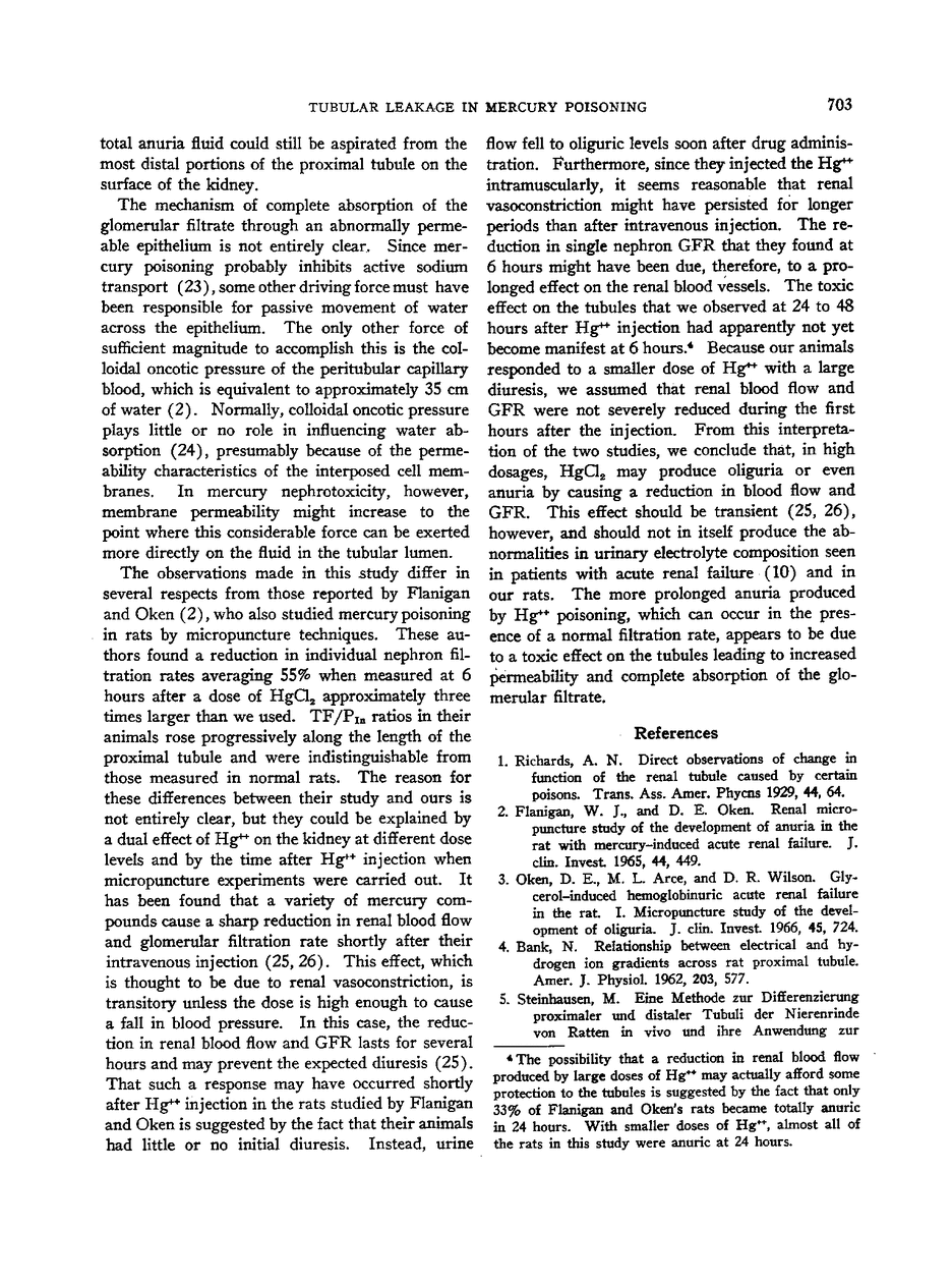 The role of “leakage” of tubular fluid in anuria produced by mercury poisoning was studied in rats by micropuncture techniques. After an initial brisk diuresis, almost all animals were completely anuric 24 hours after HgCl2 injection. Lissamine green injected intravenously in the early stage of anuria appeared in the beginning of the proximal tubule, but the color became progressively lighter as the dye traversed the proximal convolutions. The dye was barely visible in the terminal segments of the proximal tubule; it did not appear at all in the distal tubules. These observations suggest that the proximal epithelium had become abnormally permeable to Lissamine green.
