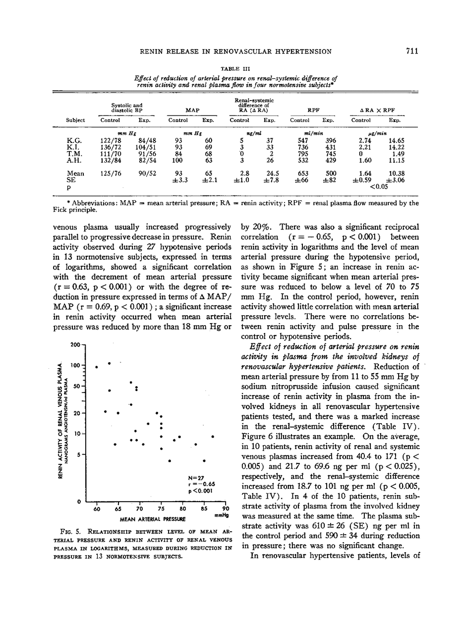 In normotensive subjects, acute reduction of mean arterial pressure to from 60 to 75 mm Hg by infusion of sodium nitroprusside caused significant increase in renin activity of renal venous plasma and also in the renal-systemic difference of renin activity. At the same time, the products of the renal-systemic difference of renin activity and renal plasma flow increased significantly, whereas renin substrate activity of plasma was unchanged, indicating that there was an increase in renin release during reduction in pressure. Renin activity of renal venous plasma, expressed in logarithms, showed a significant correlation with the degree of reduction in pressure; an increase in renin activity became significant when mean arterial pressure was reduced to below a level of 70 to 75 mm Hg.