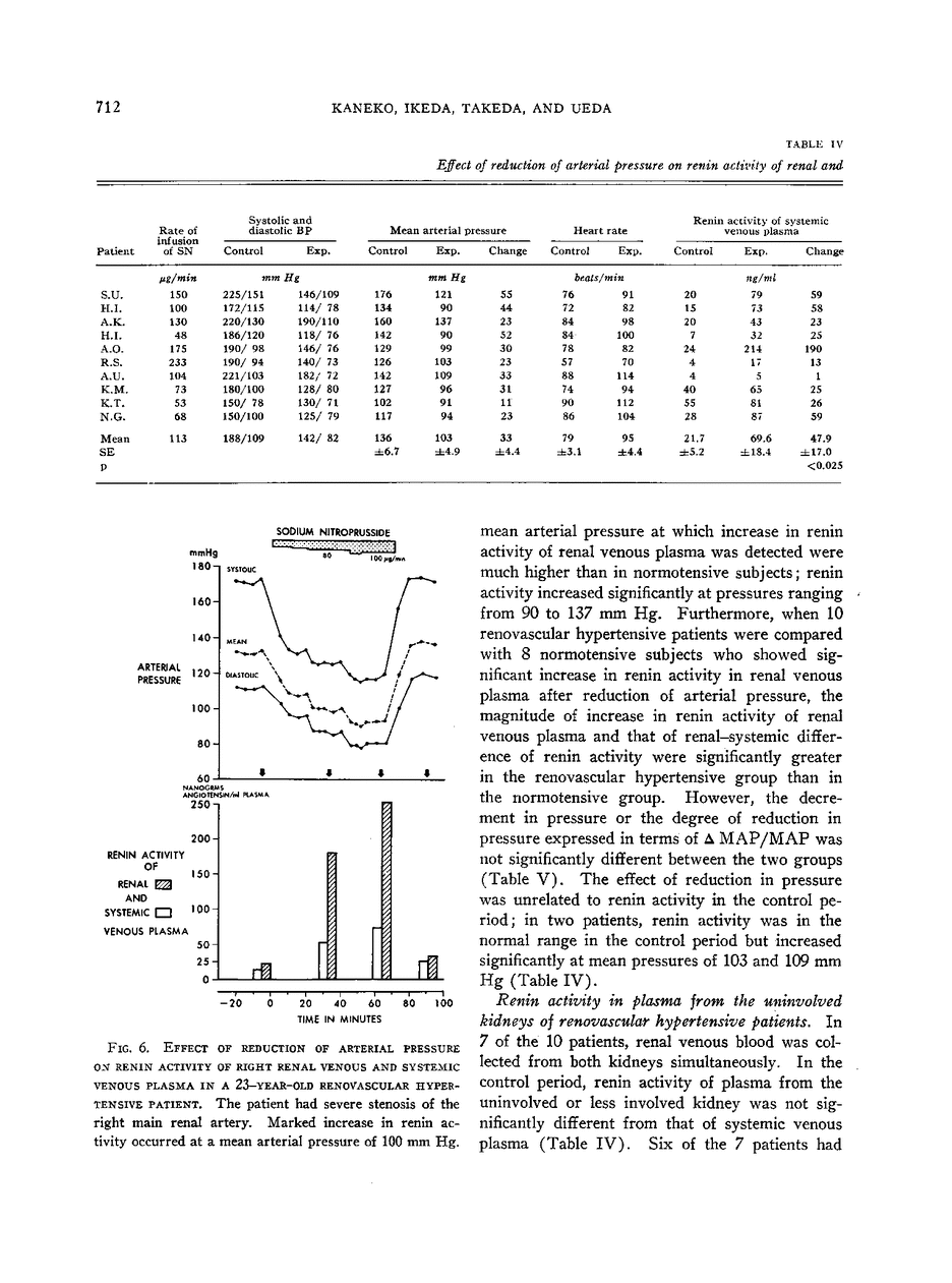 In normotensive subjects, acute reduction of mean arterial pressure to from 60 to 75 mm Hg by infusion of sodium nitroprusside caused significant increase in renin activity of renal venous plasma and also in the renal-systemic difference of renin activity. At the same time, the products of the renal-systemic difference of renin activity and renal plasma flow increased significantly, whereas renin substrate activity of plasma was unchanged, indicating that there was an increase in renin release during reduction in pressure. Renin activity of renal venous plasma, expressed in logarithms, showed a significant correlation with the degree of reduction in pressure; an increase in renin activity became significant when mean arterial pressure was reduced to below a level of 70 to 75 mm Hg.