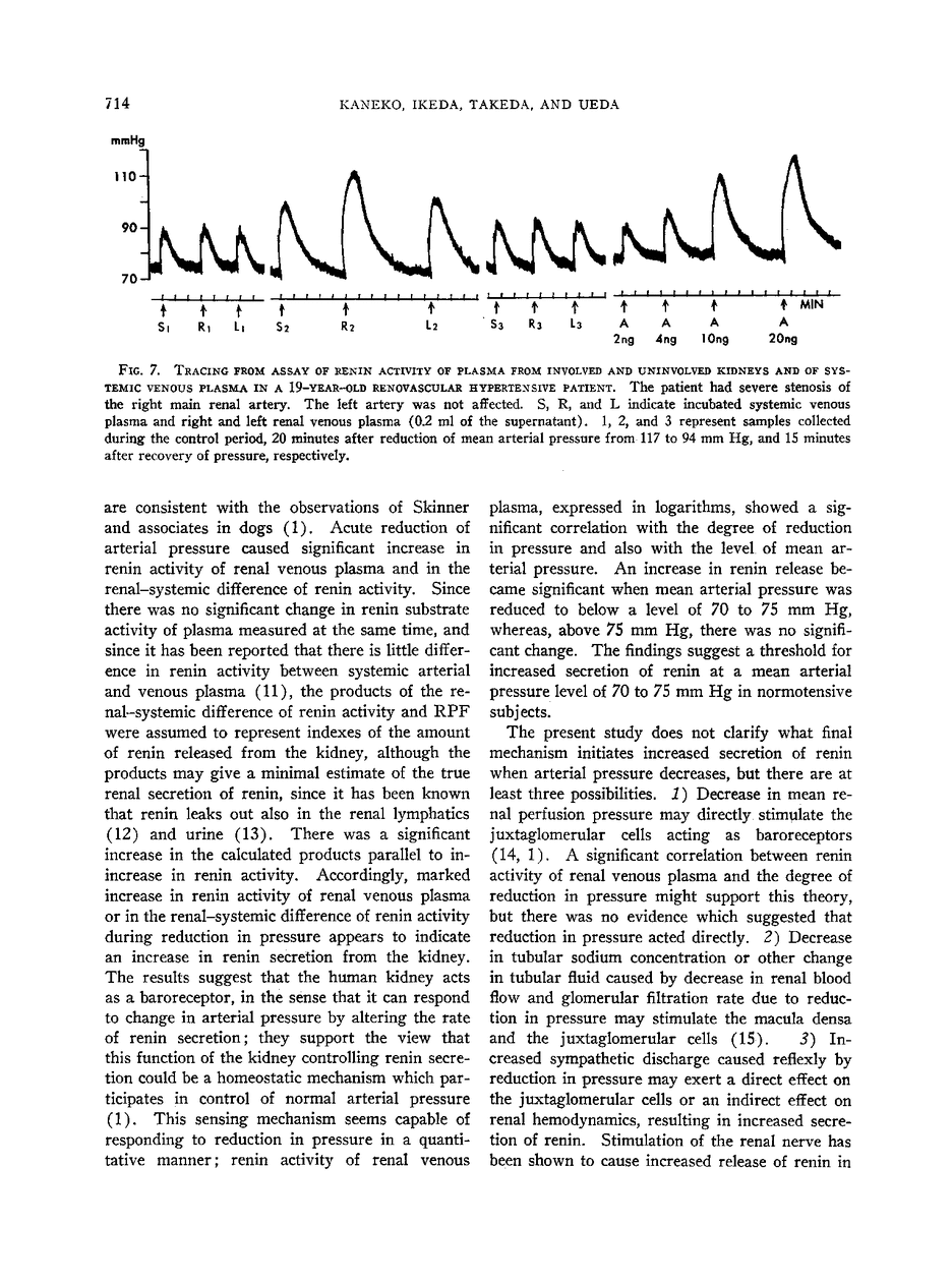In normotensive subjects, acute reduction of mean arterial pressure to from 60 to 75 mm Hg by infusion of sodium nitroprusside caused significant increase in renin activity of renal venous plasma and also in the renal-systemic difference of renin activity. At the same time, the products of the renal-systemic difference of renin activity and renal plasma flow increased significantly, whereas renin substrate activity of plasma was unchanged, indicating that there was an increase in renin release during reduction in pressure. Renin activity of renal venous plasma, expressed in logarithms, showed a significant correlation with the degree of reduction in pressure; an increase in renin activity became significant when mean arterial pressure was reduced to below a level of 70 to 75 mm Hg.