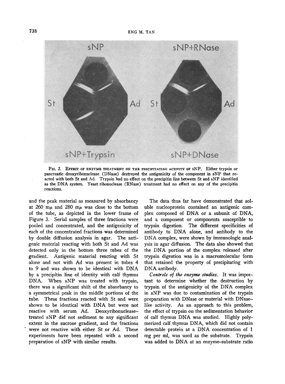 Double diffusion in agarose was employed for the characterization of a soluble nucleoprotein antigen that gave precipitin reactions with sera from patients with systemic lupus erythematosus. The soluble antigen that was isolated from calf thymus nuclei was demonstrated by enzyme degradation and ultracentrifugation studies, and by immunologic analysis, to be a complex of deoxyribonucleic acid and a moiety susceptible to proteolytic digestion. Antibody to soluble nucleoprotein did not react with the DNA portion of the complex released after proteolytic digestion or with purified calf thymus DNA. Immunologic reaction of identity was obtained between the soluble nucleoprotein antigen and synthesized DNA-histone complex, suggesting that the protein moiety of soluble nucleoprotein might in part be composed of histone. Antibody to soluble nucleoprotein was present in 51% of systemic lupus erythematosus sera examined and was more common than antibody to deoxyribonucleic acid.