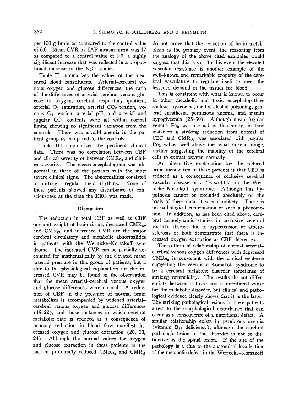 Cerebral blood flow and metabolism were measured by the iodoantipyrine-4-131I method in nine patients and by the nitrous oxide method in three patients with the Wernicke-Korsakoff syndrome.