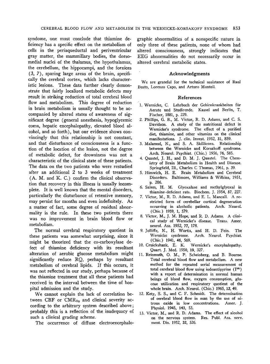 Cerebral blood flow and metabolism were measured by the iodoantipyrine-4-131I method in nine patients and by the nitrous oxide method in three patients with the Wernicke-Korsakoff syndrome.