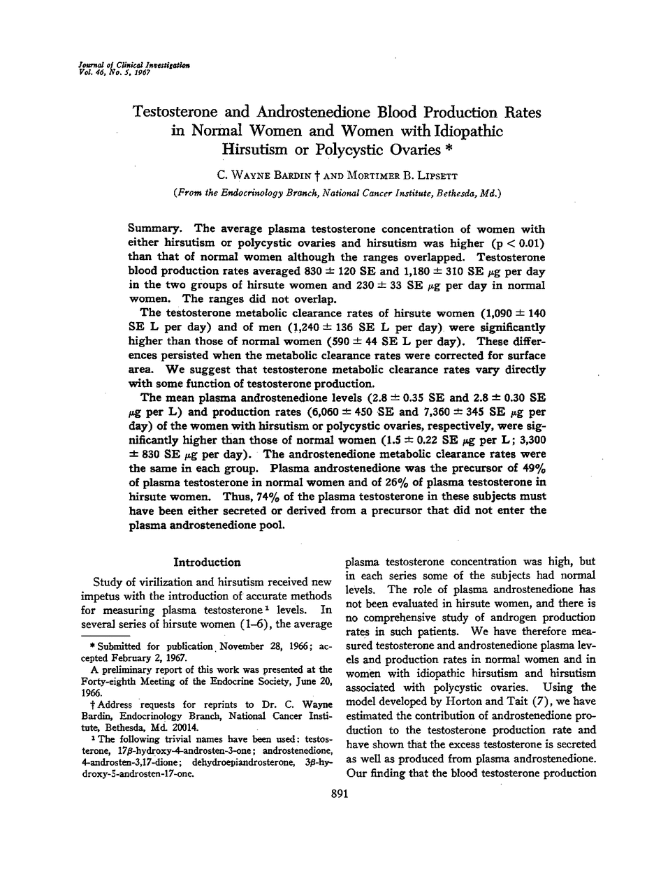 The average plasma testosterone concentration of women with either hirsutism or polycystic ovaries and hirsutism was higher (p < 0.01) than that of normal women although the ranges overlapped. Testosterone blood production rates averaged 830 ± 120 SE and 1,180 ± 310 SE μg per day in the two groups of hirsute women and 230 ± 33 SE μg per day in normal women. The ranges did not overlap.