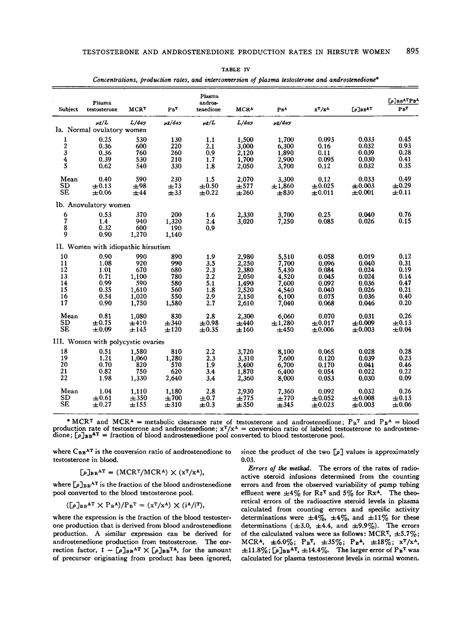 The average plasma testosterone concentration of women with either hirsutism or polycystic ovaries and hirsutism was higher (p < 0.01) than that of normal women although the ranges overlapped. Testosterone blood production rates averaged 830 ± 120 SE and 1,180 ± 310 SE μg per day in the two groups of hirsute women and 230 ± 33 SE μg per day in normal women. The ranges did not overlap.