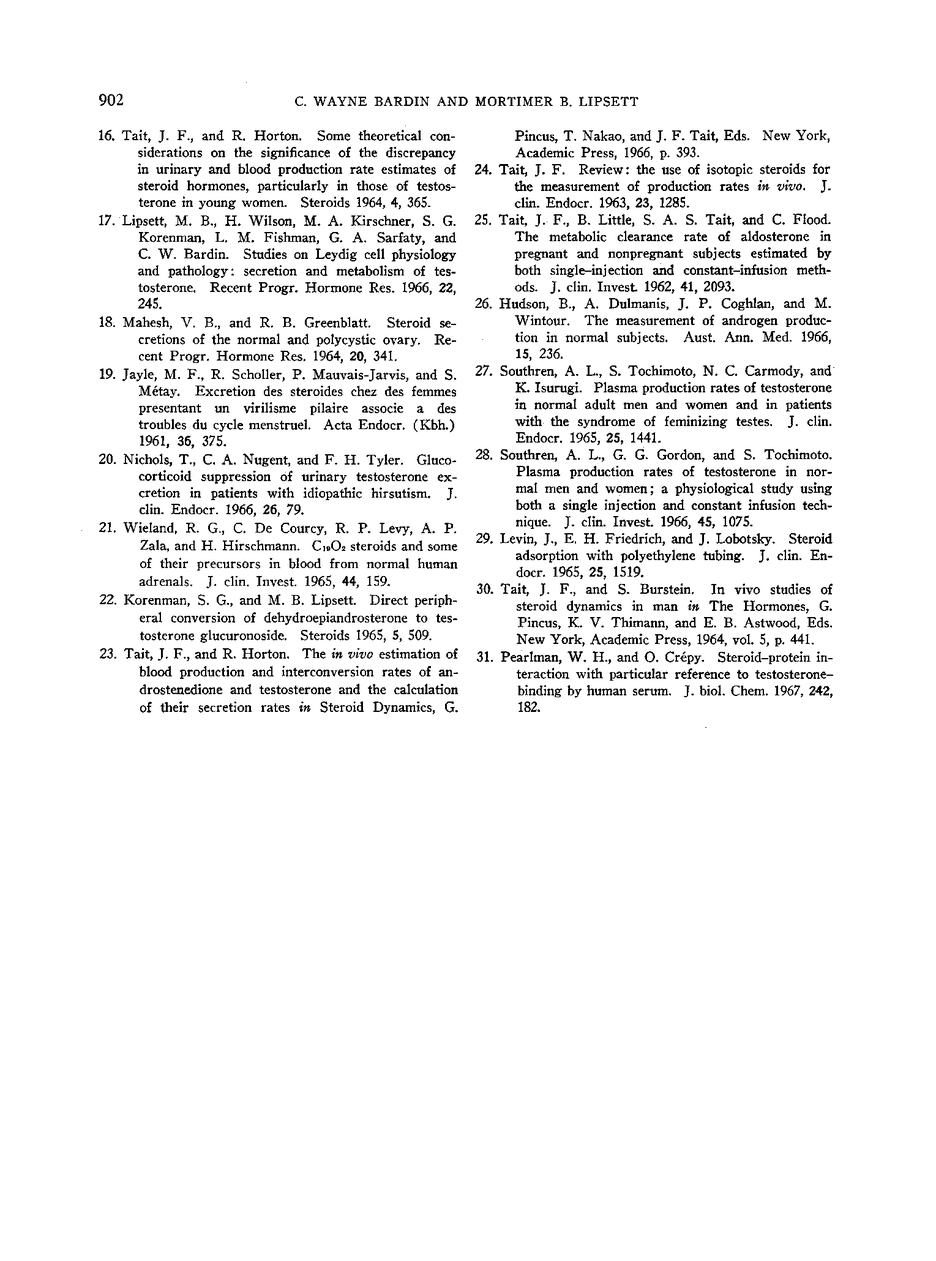 The average plasma testosterone concentration of women with either hirsutism or polycystic ovaries and hirsutism was higher (p < 0.01) than that of normal women although the ranges overlapped. Testosterone blood production rates averaged 830 ± 120 SE and 1,180 ± 310 SE μg per day in the two groups of hirsute women and 230 ± 33 SE μg per day in normal women. The ranges did not overlap.