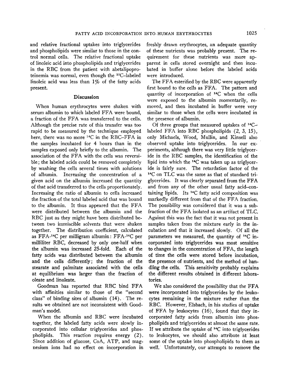 When human erythrocytes were incubated in vitro with 14C-labeled free fatty acids bound to serum albumin, labeled fatty acids were incorporated into erythrocyte triglycerides and phospholipids. The first step in this reaction was the transfer of free fatty acids from the albumin to the cells. This transfer was rapid and reversible. The acids were distributed between albumin and cells according to the relative quantities of albumin and cells present. Each acid had a different distribution coefficient. At equilibrium, relatively larger fractions of the stearic and palmitic acids and smaller fractions of the oleic and linoleic were associated with the cells. All these fatty acids were then slowly incorporated into phospholipids and triglycerides. The rate of incorporation of each was a function of its concentration in the cells, but larger fractions of the oleic and linoleic were incorporated than of the stearic, palmitic, myristic, or lauric. The two processes of transfer and incorporation thus had almost opposite selectivities for the different fatty acids. As a result, the fatty acids incorporated into triglycerides and phospholipids resembled in composition the fatty acids on the albumin except for moderately less stearic acid.