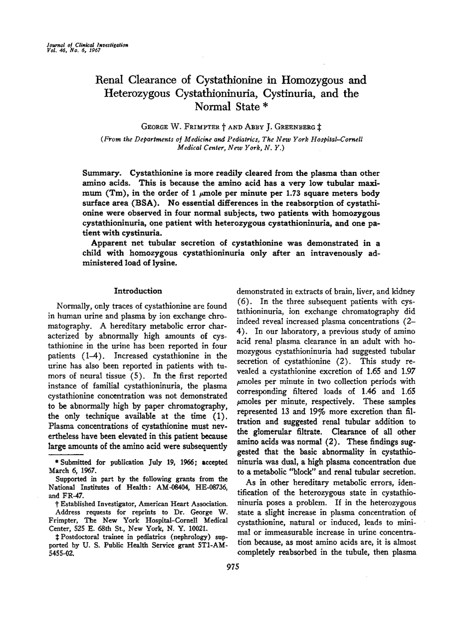 Cystathionine is more readily cleared from the plasma than other amino acids. This is because the amino acid has a very low tubular maximum (Tm), in the order of 1 μmole per minute per 1.73 square meters body surface area (BSA). No essential differences in the reabsorption of cystathionine were observed in four normal subjects, two patients with homozygous cystathioninuria, one patient with heterozygous cystathioninuria, and one patient with cystinuria.