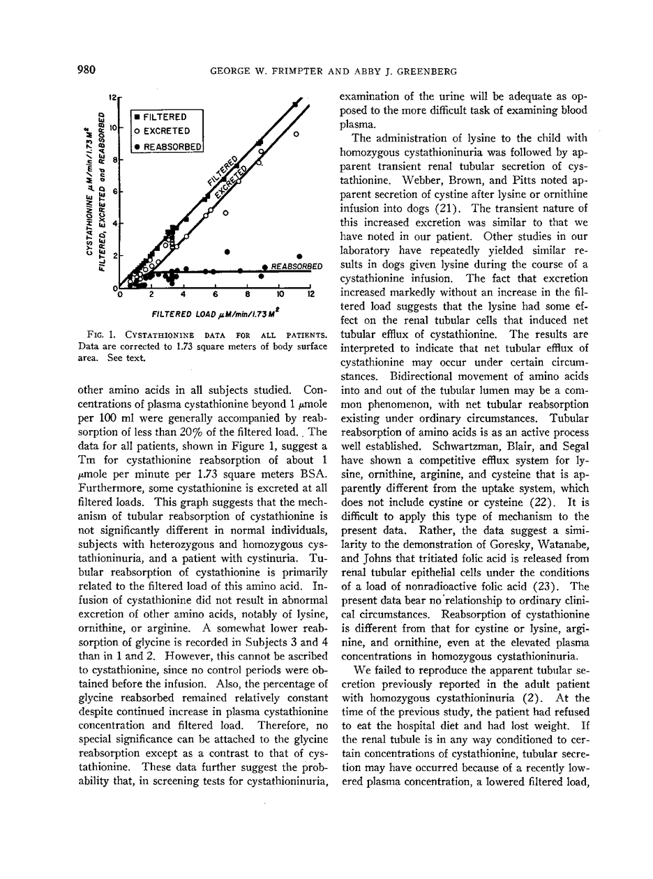 Cystathionine is more readily cleared from the plasma than other amino acids. This is because the amino acid has a very low tubular maximum (Tm), in the order of 1 μmole per minute per 1.73 square meters body surface area (BSA). No essential differences in the reabsorption of cystathionine were observed in four normal subjects, two patients with homozygous cystathioninuria, one patient with heterozygous cystathioninuria, and one patient with cystinuria.