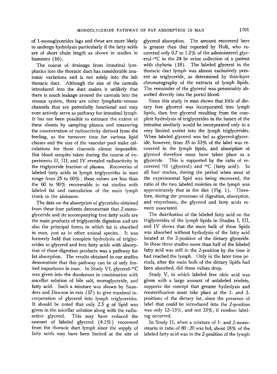 The absorption of fat was studied in five male subjects with cannulation of the thoracic duct in the neck by the administration of doubly labeled monoglycerides, or triglyceride as well as labeled free glycerol or labeled free oleic acid, by gastric or duodenal intubation.