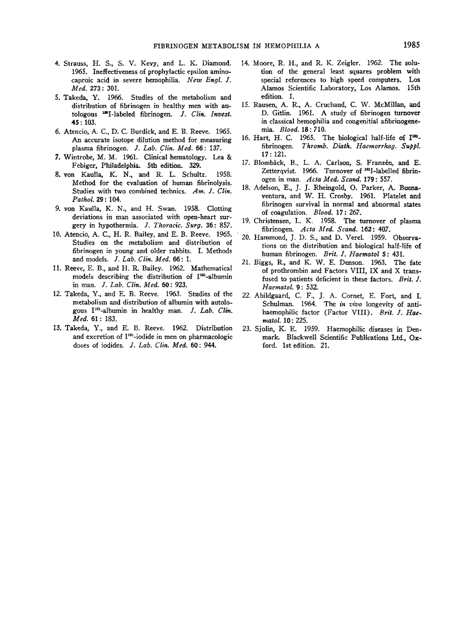 Using autologous 131I-fibrinogen, we made studies of the metabolism and distribution of fibrinogen in 10 patients with hemophilia A. In two patients simultaneous studies of autologous 131I-fibrinogen and homologous 125I-fibrinogen prepared from healthy donors' plasma were carried out. The average value for the plasma volume was 42.1 ± 8.8 ml/kg; for the plasma fibrinogen concentration, 349 ± 90 mg/100 ml; for the intravascular fibrinogen, 144 ± 32 mg/kg; for the interstitial fibrinogen, 30 ± 11 mg/kg; for the slower half-life of 131I-fibrinogen, 2.34 ± 0.17 days; for the transcapillary transfer rate of fibrinogen, 109 ± 37 mg/kg per day; and for the catabolic and synthetic rates of fibrinogen, 51.7 ± 13.1 mg/kg per day. Comparison of these results with those of the previous study in healthy male subjects showed that in patients with hemophilia A the catabolic and synthetic rates of fibrinogen are markedly increased, whereas the plasma fibrinogen concentration, intravascular and interstitial fibrinogen, and the transcapillary transfer rate of fibrinogen are not significantly different. The simultaneous studies of autologous 131I-fibrinogen and normal homologous 125I-fibrinogen in two subjects revealed that the two preparations behaved very similarly. Based on these findings, we concluded that our present findings are not due to the qualitative difference between the hemophilia A and normal fibrinogens, but that they are due to the difference in the host condition with respect to the fibrinogen metabolism, which is either an increased rate of direct breakdown of fibrinogen or an increased rate of fibrinogen breakdown after fibrin formation, or both.